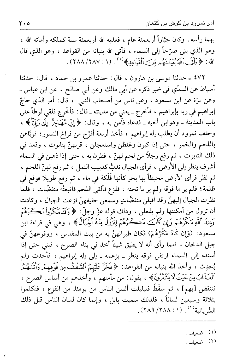 ٤٧٢ - حدثنا موسى بن هارون، قال: حدثنا عمرو بن حماد، قال: حدثنا أسباط عن السدّي في خبر ذكره عن أبي مالك وعن أبي صالح، عن ابن عباس- وعن مرّة عن ابن مسعود، وعن ناس من أصحاب النبي، قال: أمر الذي حاجّ إبراهيم في ربه بإبراهيم، فأخرِج -يعني من مدينته- قال: فأخْرِج فلقي لوطًا علي باب المدينة -وهو ابن أخيه- فدعاه فآمن به، وقال: {إِنِّي مُهَاجِرٌ إِلَى رَبِّي}، وحلف نمرود أن يطلب إله إبراهيم، فأخذ أربعة أفرُخ من فراخ النسور؛ فربَّاهن باللحم والخمر، حتى إذا كبرن وغلظن واستعجلن، قرنهنّ بتابوت، وقعد في ذلك التابوت، ثم رفع رجلًا من لحم لهنّ، فطرن به، حتى إذا ذهبن في السماء أشرف ينظر إلي الأرض، فرأي الجبال تدبُّ كدبيب النمل، ثم رفع لهنّ اللحم، ثم نظر فرأي الأرض محيطًا يها بحر كأنها فَلْكة في ماء، ثم رفع طويلا فوقع في ظلمة؛ فلم ير ما فوقه ولم ير ما تحته، ففزع فألقى اللحم فاتبعتْه منقضّات، فلما نظرت الجبال إليهنَّ وقد أقبلن منقضَّاتٍ وسمعن حفيفهنّ فزعت الجبال، وكادت أن تزول من أمكنتها ولم يفعلن، وذلك قوله عزَّ وجلّ: {وَقَدْ مَكَرُوا مَكْرَهُمْ وَعِنْدَ اللَّهِ مَكْرُهُمْ وَإِنْ كَانَ مَكْرُهُمْ لِتَزُولَ مِنْهُ الْجِبَالُ (٤٦)}، وهي في قراءة ابن مسعود: (وَإِن كَادَ مَكْرُهُمْ) فكان طيرانهنَّ به من بيت المقدس، ووقوعهنّ في جبل الدخان، فلما رأي أنه لا يطيق شيئًا أخذ في بناء الصرح، فبني حتى إذا أسنده إلي السماء ارتقي فوقه ينظر -بزعمه- إلي إله إبراهيم، فأحدث ولم يُحدِث، وأخذ الله بنيانه من القواعد: {فَخَرَّ عَلَيهِمُ السَّقْفُ مِنْ فَوْقِهِمْ وَأَتَاهُمُ الْعَذَابُ مِنْ حَيثُ لَا يَشْعُرُونَ (٢٦)}، يقول: من مأمنهم، وأخذهم من أساس الصرح، فتنقض [بهم]، ثم سقَطَ فتبلبلت ألسن الناس من يومئذ من الفزع، فتكلموا بثلاثة وسبعين لسانًا، فلذلك سميت بابل، وإنما كان لسان الناس قبل ذلك السُّريانية (٢). (١: ٢٨٨/ ٢٨٩).