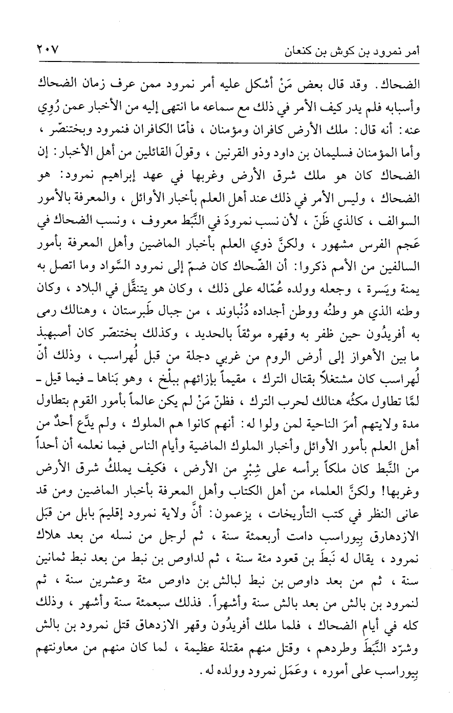 الضحاك. وقد قال بعض مَنْ أشكل عليه أمر نمرود ممن عرف زمان الضحاك وأسبابه فلم يدر كيف الأمر في ذلك مع سماعه ما انتهي إليه من الأخبار عمن رُوي عنه: أنه قال: ملك الأرض كافران ومؤمنان، فأمّا الكافران فنمرود وبختنصّر، وأما المؤمنان فسليمان بن داود وذو القرنين، وقولَ القائلين من أهل الأخبار: إن الضحاك كان هو ملك شرق الأرض وغربها في عهد إبراهيم نمرود: هو الضحاك، وليس الأمر في ذلك عند أهل العلم بأخبار الأوائل، والمعرفة بالأمور السوالف، كالذي ظَنّ، لأن نسب نمرودَ في النَّبَط معروف، ونسب الضحاك في عَجم الفرس مشهور، ولكنَّ ذوي العلم بأخبار الماضين وأهل المعرفة بأمور السالفين من الأمم ذكروا: أن الضّحاك كان ضمّ إلي نمرود السَّواد وما اتصل به يمنة ويَسرة، وجعله وولده عُمّاله علي ذلك، وكان هو يتنقَّل في البلاد، وكان وطنه الذي هو وطنُه ووطن أجداده دُنْباوند، من جبال طَبرستان، وهنالك رمي به أفريدُون حين ظفر به وقهره موثقًا بالحديد، وكذلك بختنصّر كان أصبهبذ ما بين الأهواز إلي أرض الروم من غربي دجلة من قبل لُهراسب، وذلك أنّ لُهراسب كان مشتغلًا بقتال الترك، مقيمًا بإزائهم ببلْخ، وهو بَناها -فيما قيل- لمَّا تطاول مكثُه هنالك لحرب الترك، فظنّ مَنْ لم يكن عالمًا بأمور القوم بتطاول مدة ولايتهم أمرَ الناحية لمن ولوا له: أنهم كانوا هم الملوك، ولم يدَّع أحدٌ من أهل العلم بأمور الأوائل وأخبار الملوك الماضية وأيام الناس فيما نعلمه أن أحدًا من النَّبط كان ملكًا برأسه علي شِبْرٍ من الأرض، فكيف يملكُ شرق الأرض وغربها! ولكنَّ العلماء من أهل الكتاب وأهل المعرفة بأخبار الماضين ومن قد عاني النظر في كتب التأريخات، يزعمون: أن ولاية نمرود إقليمَ بابل من قبَل الازدهارق بِيوراسب دامت أربعمئة سنة، ثم لرجل من نسله من بعد هلاك نمرود، يقال له نَبطَ بن قعود مئة سنة، ثم لداوص بن نبط من بعد نبط ثمانين سنة، ثم من بعد داوص بن نبط لبالش بن داوص مئة وعشرين سنة، ثم لنمرود بن بالش من بعد بالش سنة وأشهرًا. فذلك سبعمئة سنة وأشهر، وذلك كله في أيام الضحاك، فلما ملك أفريدُون وقهر الازدهاق قتل نمرود بن بالش وشرّد النَّبَطَ وطردهم، وقتل منهم مقتلة عظيمة، لما كان منهم من معاونتهم بِيوراسب علي أموره، وعَمَل نمرود وولده له.