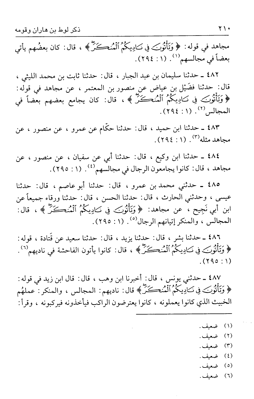 ٤٨٢ - حدثنا سليمان بن عبد الجبار، قال: حدثنا ثابت بن محمد الليثي، قال: حدثنا فضَيل بن عياض عن منصور بن المعتمر، عن مجاهد في قوله: {وَتَأْتُونَ فِي نَادِيكُمُ الْمُنْكَرَ}، قال: كان يجامع بعضهم بعضًا في المجالس (٢). (١: ٢٩٤).