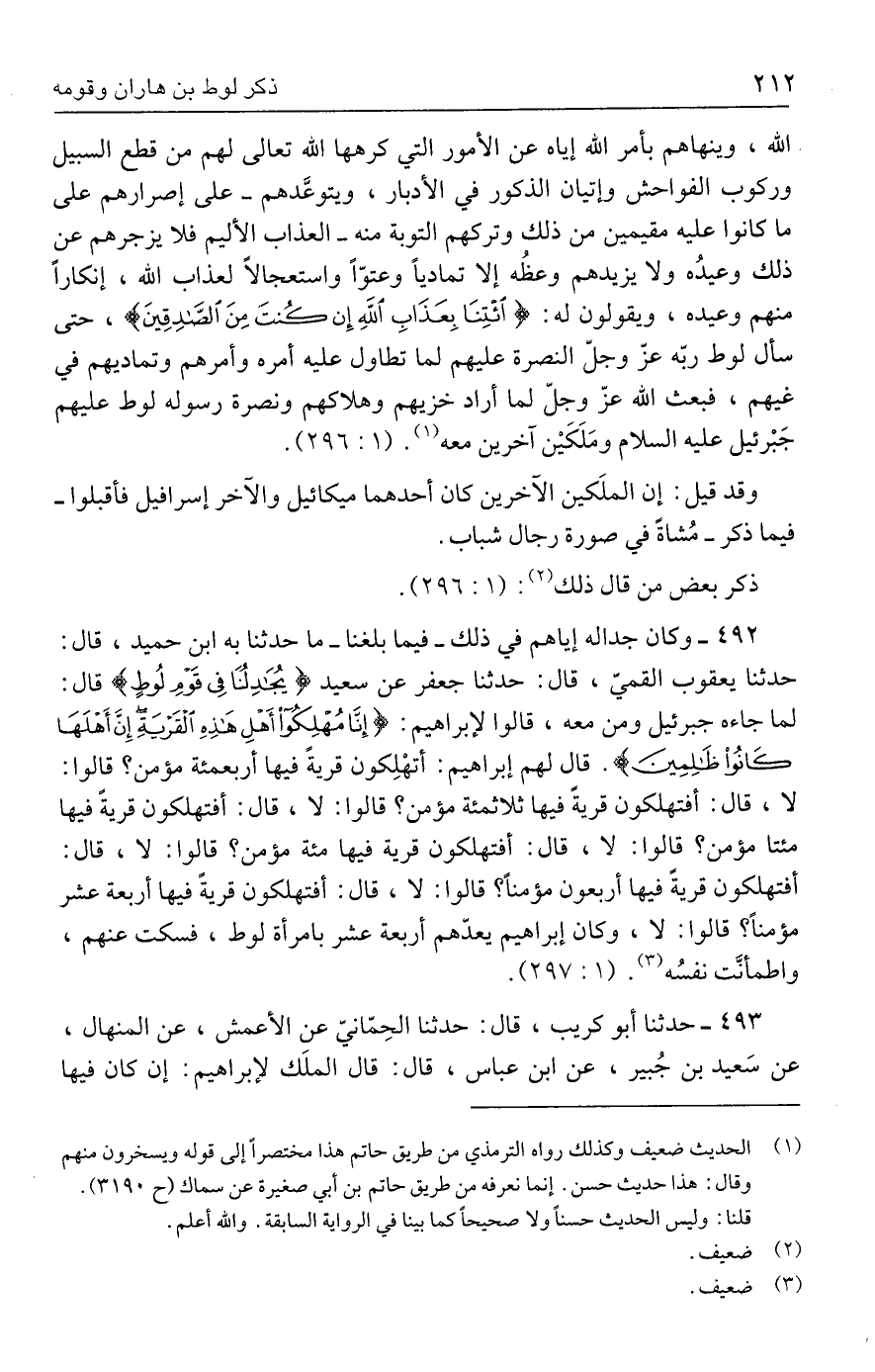 ٤٩٢ - وكان جداله إياهم في ذلك -فيما بلغنا- ما حدثنا به ابن حميد، قال: حدثنا يعقوب القميّ، قال: حدثنا جعفر عن سعيد {يُجَادِلُنَا فِي قَوْمِ لُوطٍ} قال: لما جاءه جبرئيل ومن معه، قالوا لإبراهيم: {إِنَّا مُهْلِكُو أَهْلِ هَذِهِ الْقَرْيَةِ إِنَّ أَهْلَهَا كَانُوا ظَالِمِينَ}. قال لهم إبراهيم: أتهْلِكون قريةً فيها أربعمئة مؤمن؟ قالوا: لا، قال: أفتهلكون قريةً فيها ثلاثمئة مؤمن؟ قالوا: لا، قال: أفتهلكون قريةً فيها مئتا مؤمن؟ قالوا: لا، قال: أفتهلكون قرية فيها مئة مؤمن؟ قالوا: لا، قال: أفتهلكون قريةً فيها أربعون مؤمنًا؟ قالوا: لا، قال: أفتهلكون قريةً فيها أربعة عشر مؤمنًا؟ قالوا: لا، وكان إبراهيم يعدّهم أربعة عشر بامرأة لوط، فسكت عنهم، واطمأنَّت نفسُه (٣). (١: ٢٩٧).