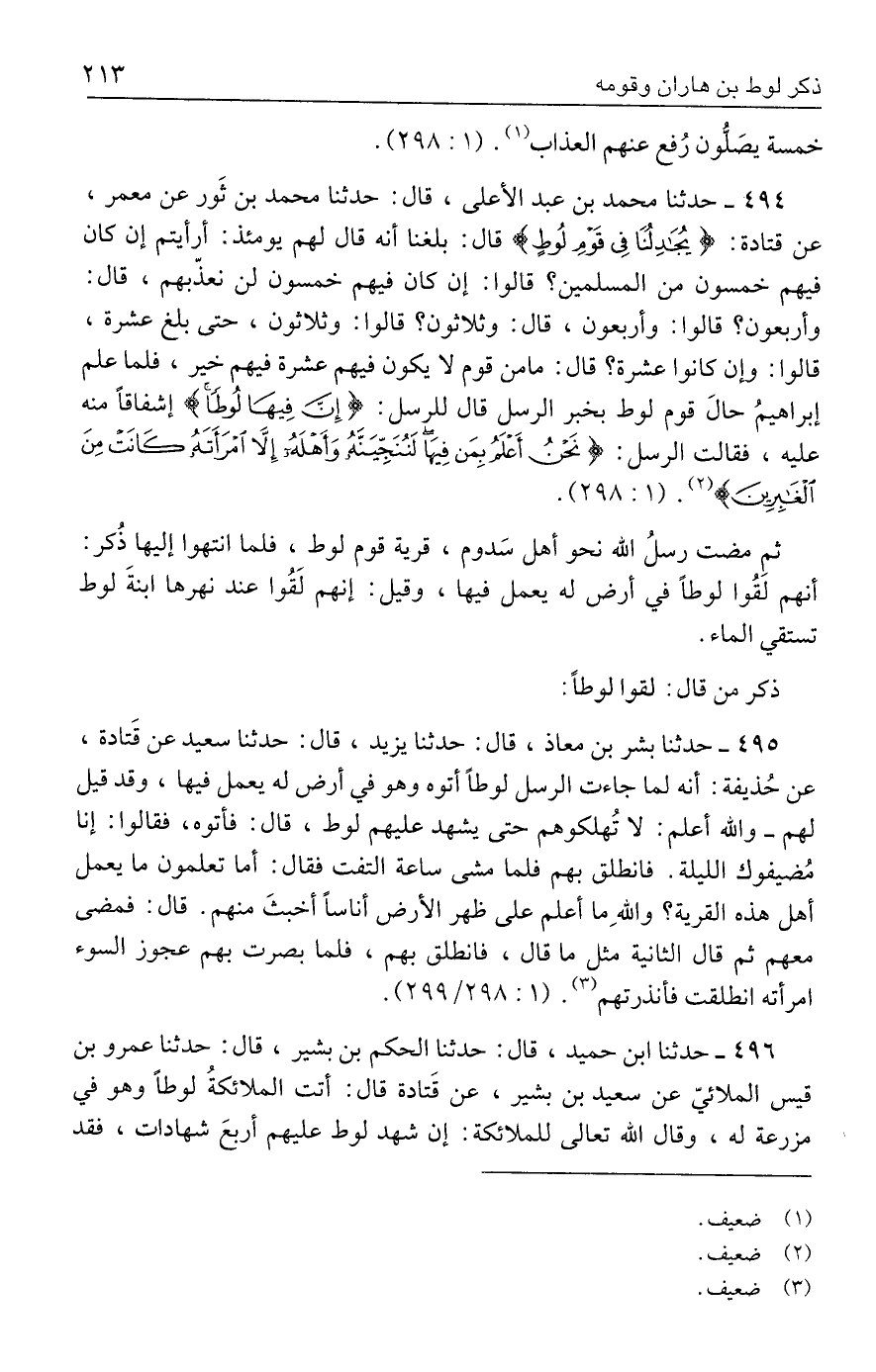 ٤٩٥ - حدثنا بشر بن معاذ، قال: حدثنا يزيد، قال: حدثنا سعيد عن قَتادة، عن حُذيفة: أنه لما جاءت الرسل لوطًا أتوه وهو في أرض له يعمل فيها، وقد قيل لهم- والله أعلم: لا تُهلكوهم حتى يشهد عليهم لوط، قال: فأتوه، فقالوا: إنا مُضيفوك الليلة. فانطلق بهم فلما مشي ساعة التفت فقال: أما تعلمون ما يعمل أهل هذه القرية؟ واللهِ ما أعلم علي ظهر الأرض أناسًا أخبثَ منهم. قال: فمضي معهم ثم قال الثانية مثل ما قال، فانطلق بهم، فلما بصرت بهم عجوز السوء امرأته انطلقت فأنذرتهم (٣). (١: ٢٩٨/ ٢٩٩).
