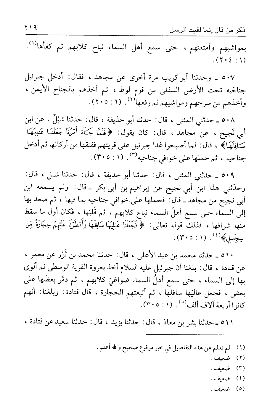 ٥٠٧ - وحدثنا أبو كريب مرة أخرى عن مجاهد، فقال: أدخل جبرئيل جناحَيه تحت الأرض السفلى من قوم لوط، ثم أخذهم بالجناح الأيمن، وأخذهم من سرحهم ومواشيهم ثم رفعها (٢). (١: ٢٠٥).