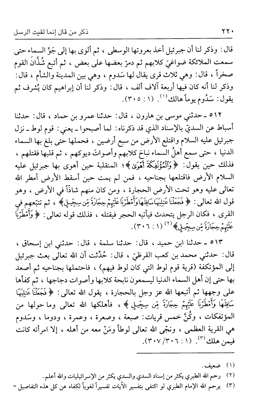 ٥١٢ - حدثني موسى بن هارون، قال: حدثنا عمرو بن حماد، قال: حدثنا أسباط عن السديّ بالإسناد الذي قد ذكرناه: لما أصبحوا -يعني: قوم لوط- نزل جبرئيل - عليه السلام - واقتلع الأرض من سبع أرضين، فحملها حتى بلغ بها السماء الدنيا، حتى سمع أهلُ السماء نباحَ كلابهم وأصواتَ ديوكهم، ثم قلبها فقتلهم، فذلك حين يقول: {وَالْمُؤْتَفِكَةَ أَهْوَى}؛ المنقلبة حين أهوى بها جبرئيل عليه السلام الأرض فاقتلعها بجناحيه، فمن لم يمت حين أسقط الأرض أمطر الله تعالى عليه وهو تحت الأرض الحجارة، ومن كان منهم شاذًّا في الأرض، وهو قول الله تعالى: {فَجَعَلْنَا عَالِيَهَا سَافِلَهَا وَأَمْطَرْنَا عَلَيهِمْ حِجَارَةً مِنْ سِجِّيلٍ}، ثم تتبّعهم في القرى، فكان الرجل يتحدث فيأتيه الحجر فيقتله، فذلك قوله تعالى: {وَأَمْطَرْنَا عَلَيهِمْ حِجَارَةً مِنْ سِجِّيلٍ} (٢) (١: ٣٠٦).