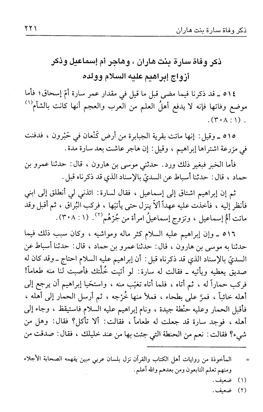 ٥١٥ - وقيل: إنها ماتت بقرية الجبابرة من أرض كَنْعان في حَبْرون، فدفنت في مزرعة اشتراها إبراهيم، وقيل: إن هاجر عاشت بعد سارة مدة.
