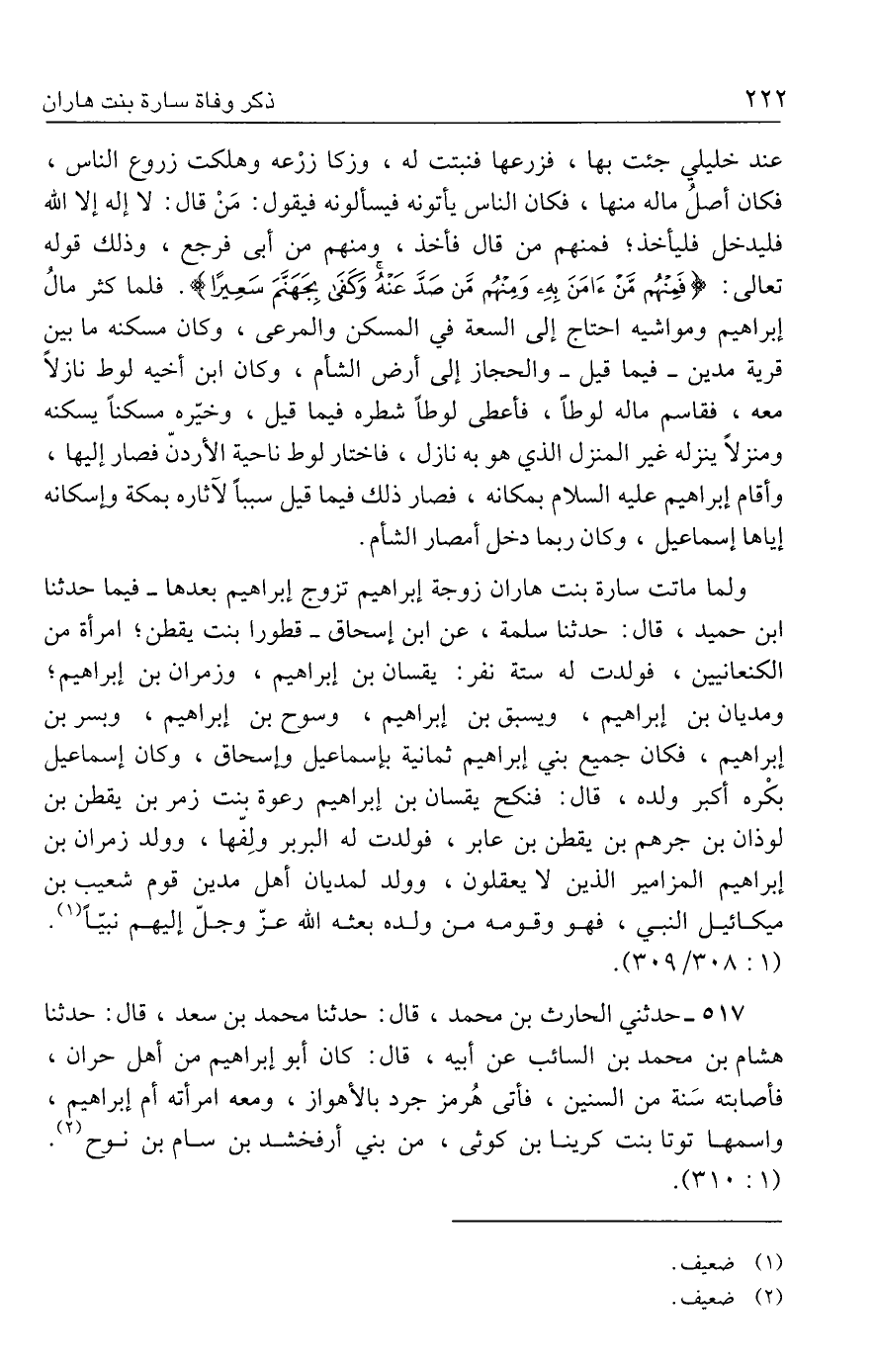 ٥١٧ - حدثني الحارث بن محمد، قال: حدثنا محمد بن سعد، قال: حدثنا هشام بن محمد بن السائب عن أبيه، قال: كان أبو إبراهيم من أهل حران، فأصابته سَنة من السنين، فأتى هُرمز جرد بالأهواز، ومعه امرأته أم إبراهيم، واسمها توتا بنت كرينا بن كوثى، من بني أرفخشد بن سام بن نوح (٢). (٣١٠: ١).