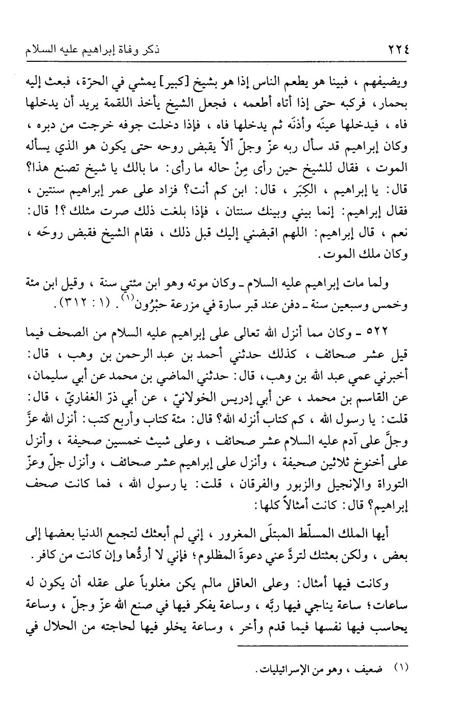 ٥٢٢ - وكان مما أنزل الله تعالى على إبراهيم - عليه السلام - من الصحف فيما قيل عشر صحائف، كذلك حدثني أحمد بن عبد الرحمن بن وهب، قال: أخبرني عمي عبد الله بن وهب، قال: حدثني الماضي بن محمد عن أبي سليمان، عن القاسم بن محمد، عن أبي إدريس الخولانيّ، عن أبي ذر الغفاريّ، قال: قلت: يا رسول الله، كم كتاب أنزله الله؟ قال: مئة كتاب وأربع كتب: أنزل الله عزَّ وجلَّ على آدم - عليه السلام - عشر صحائف، وعلى شيث خمسين صحيفة، وأنزل على أخنوخ ثلاثين صحيفة، وأنزل على إبراهيم عشر صحائف، وأنزل جلّ وعزّ التوراة والإنجيل والزبور والفرقان، قلت: يا رسول الله، فما كانت صحف إبراهيم؟ قال: كانت أمثالًا كلها: