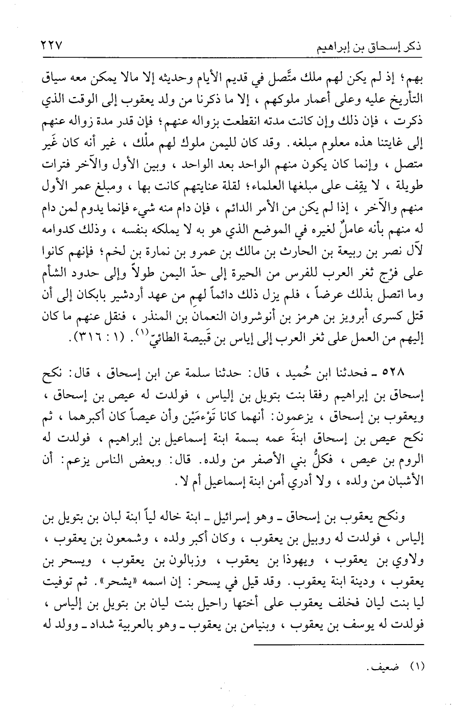 ٥٢٨ - فحدثنا ابن حُميد، قال: حدثنا سلمة عن ابن إسحاق، قال: نكح إسحاق بن إبراهيم رفقا بنت بتويل بن إلياس، فولدت له عيص بن إسحاق، ويعقوب بن إسحاق، يزعمون: أنهما كانا تَوْءمَين وأن عيصًا كان أكبرهما، ثم نكح عيص بن إسحاق ابنةَ عمه بسمة ابنة إسماعيل بن إبراهيم، فولدت له الروم بن عيص، فكلُّ بني الأصفر من ولده. قال: وبعض الناس يزعم: أن الأشبان من ولده، ولا أدري أمن ابنة إسماعيل أم لا.