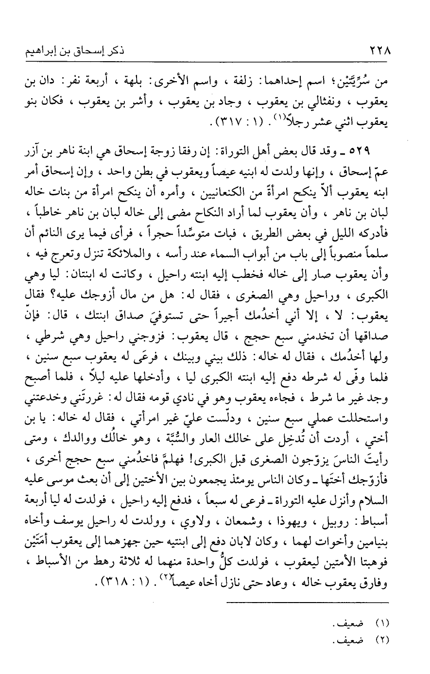 ٥٢٩ - وقد قال بعض أهل التوراة: إن رفقا زوجة إسحاق هي ابنة ناهر بن آزر عمّ إسحاق، وإنها ولدت له ابنيه عيصًا ويعقوب في بطن واحد، وإن إسحاق أمر ابنه يعقوب ألّا ينكح امرأةً من الكنعانيين، وأمره أن ينكح امرأة من بنات خاله لبان بن ناهر، وأن يعقوب لما أراد النكاح مضى إلى خاله لبان بن ناهر خاطبًا، فأدركه الليل في بعض الطريق، فبات متوسِّدًا حجرًا، فرأى فيما يرى النائم أن سلمًا منصوبًا إلى باب من أبواب السماء عند رأسه، والملائكة تنزل وتعرج فيه، وأن يعقوب صار إلى خاله فخطب إليه ابنته راحيل، وكانت له ابنتان: ليا وهي الكبرى، وراحيل وهي الصغرى، فقال له: هل من مال أزوجك عليه؟ فقال يعقوب: لا، إلا أني أخدُمك أجيرًا حتى تستوفيَ صداق ابنتك، قال: فإن صداقها أن تخدمني سبع حجج، قال يعقوب: فزوجني راحيل وهي شرطي، ولها أخدُمك، فقال له خاله: ذلك بيني وبينك، فرعَى له يعقوب سبع سنين، فلما وفّى له شرطه دفع إليه ابنته الكبرى ليا، وأدخلها عليه ليلًا، فلما أصبح وجد غير ما شرط، فجاءه يعقوب وهو في نادي قومه فقال له: غررتَني وخدعتني واستحللت عملي سبع سنين، ودلّست عليّ غير امرأتي، فقال له خاله: يا بن أختي، أردت أن تُدخِل على خالك العار والسُّبَّة، وهو خالُك ووالدك، ومتى رأيتَ الناسَ يزوّجون الصغرى قبل الكبرى! فهلمَّ فاخدُمني سبع حجج أخرى، فأزوّجك أختَها -وكان الناس يومئذ يجمعون بين الأختين إلى أن بعث موسى عليه السلام وأنزل عليه التوراة- فرعى له سبعًا، فدفع إليه راحيل، فولدت له ليا أربعة أسباط: روبيل، ويهوذا، وشمعان، ولاوي، وولدت له راحيل يوسف وأخاه بنيامين وأخوات لهما، وكان لابان دفع إلى ابنتيه حين جهزهما إلى يعقوب أمَتَين فوهبتا الأمتين ليعقوب، فولدت كلُّ واحدة منهما له ثلاثة رهط من الأسباط، وفارق يعقوب خاله، وعاد حتى نازل أخاه عيصًا (٢). (١: ٣١٨).