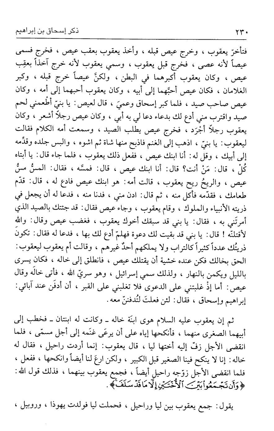 فتأخرّ يعقوب، وخرج عيص قبله، وأخذ يعقوب بعقب عيص، فخرج فسمى عيصًا لأنه عصى، فخرج قبل يعقوب، وسمي يعقوب لأنه خرج آخذًا بعقِب عيص، وكان يعقوب أكبرهما في البطن، ولكنَّ عيصًا خرج قبله، وكبر الغلامان، فكان عيص أحبَّهما إلى أبيه، وكان يعقوب أحبهما إلى أمه، وكان عيص صاحب صيد، فلما كبر إسحاق وعميَ، قال لعيص: يا بنيّ أطْعمني لحم صيد واقترب مني أدع لك بدعاء دعا لي به أبي، وكان عيص رجلًا أشعر، وكان يعقوب رجلًا أجْرَد، فخرج عيص يطلب الصيد، وسمعت أمه الكلام فقالت ليعقوب: يا بنيّ، اذهب إلى الغنم فاذبح منها شاة ثم اشوه، والبس جلده وقدِّمه إلى أبيك، وقل له: أنا ابنك عيص، ففعل ذلك يعقوب، فلما جاء قال: يا أبتاه كُلْ، قال: مَنْ أنت؟ قال: أنا ابنك عيص، قال: فمسَّه، فقال: المسُّ مسُّ عيص، والريحُ ريح يعقوب، قالت أمه: هو ابنك عيص فادع له، قال: قدّم طعامك، فقدّمه فأكل منه، ثم قال: ادن مني، فدنا منه، فدعا له أن يجعل في ذريته الأنبياء والملوك، وقام يعقوب، وجاء عيص فقال: قد جئتك بالصيد الذي أمرتَني به، فقال: يا بني قد سبقك أخوك يعقوب، فغضب عيص وقال: والله لأقتلنّه! قال: يا بني قد بقيت لك دعوة فهلمّ أدع لك بها، فدعا له فقال: تكونَ ذريتُك عددًا كثيرًا كالتراب ولا يملكهم أحدٌ غيرهم، وقالت أم يعقوب ليعقوب: الحق بخالك فكن عنده خشية أن يقتلك عيص، فانطلق إلى خاله، فكان يسرى بالليل ويكمن بالنهار، ولذلك سمي إسرائيل، وهو سريّ الله، فأتى خاله وقال عيص: أما إذْ غلبتني على الدعوى فلا تغلبني على القبر، أن أدفَن عند آبائي: إبراهيم وإسحاق، فقال: لئن فعلتَ لتُدفننّ معه.