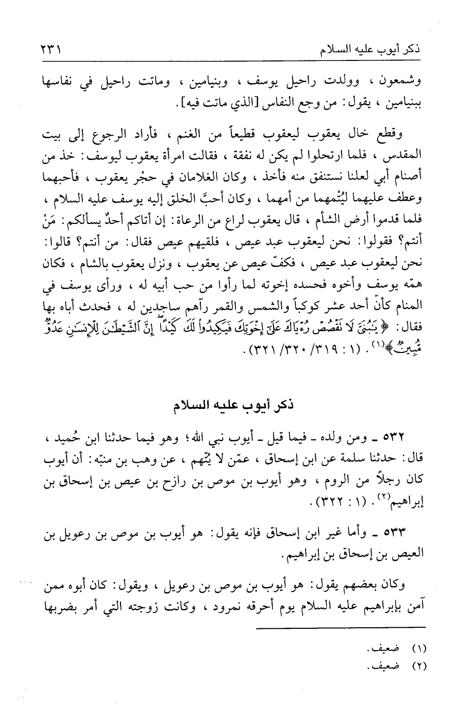 ٥٣٣ - وأما غير ابن إسحاق فإنه يقول: هو أيوب بن موص بن رعويل بن العيص بن إسحاق بن إبراهيم.