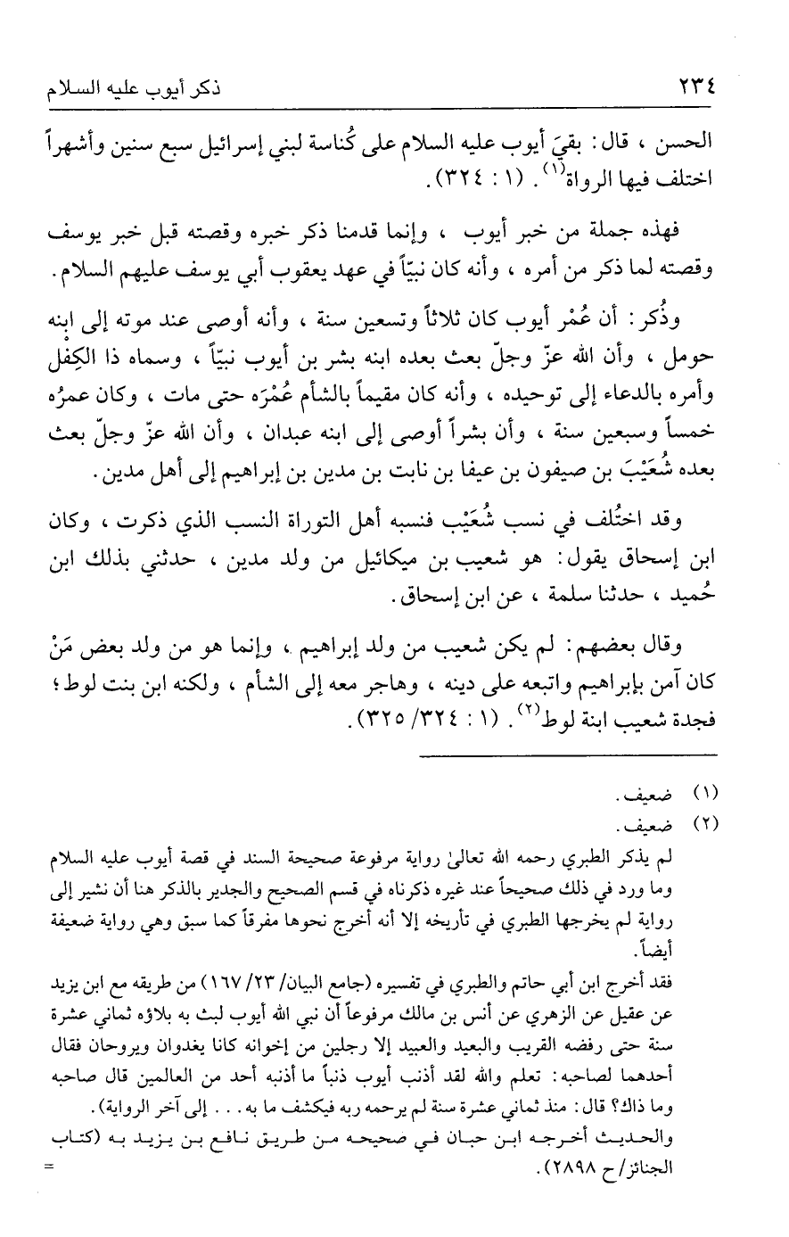 وذُكر: أن عُمْر أيوب كان ثلاثًا وتسعين سنة، وأنه أوصى عند موته إلى ابنه حومل، وأن الله عزّ وجلّ بعث بعده ابنه بشر بن أيوب نبيًّا، وسماه ذا الكِفْل وأمره بالدعاء إلى توحيده، وأنه كان مقيمًا بالشام عُمْرَه حتى مات، وكان عمرُه خمسًا وسبعين سنة، وأن بشرًا أوصى إلى ابنه عبدان، وأن الله عزّ وجلّ بعث بعده شُعَيبَ بن صيفون بن عيفا بن نابت بن مدين بن إبراهيم إلى أهل مدين.