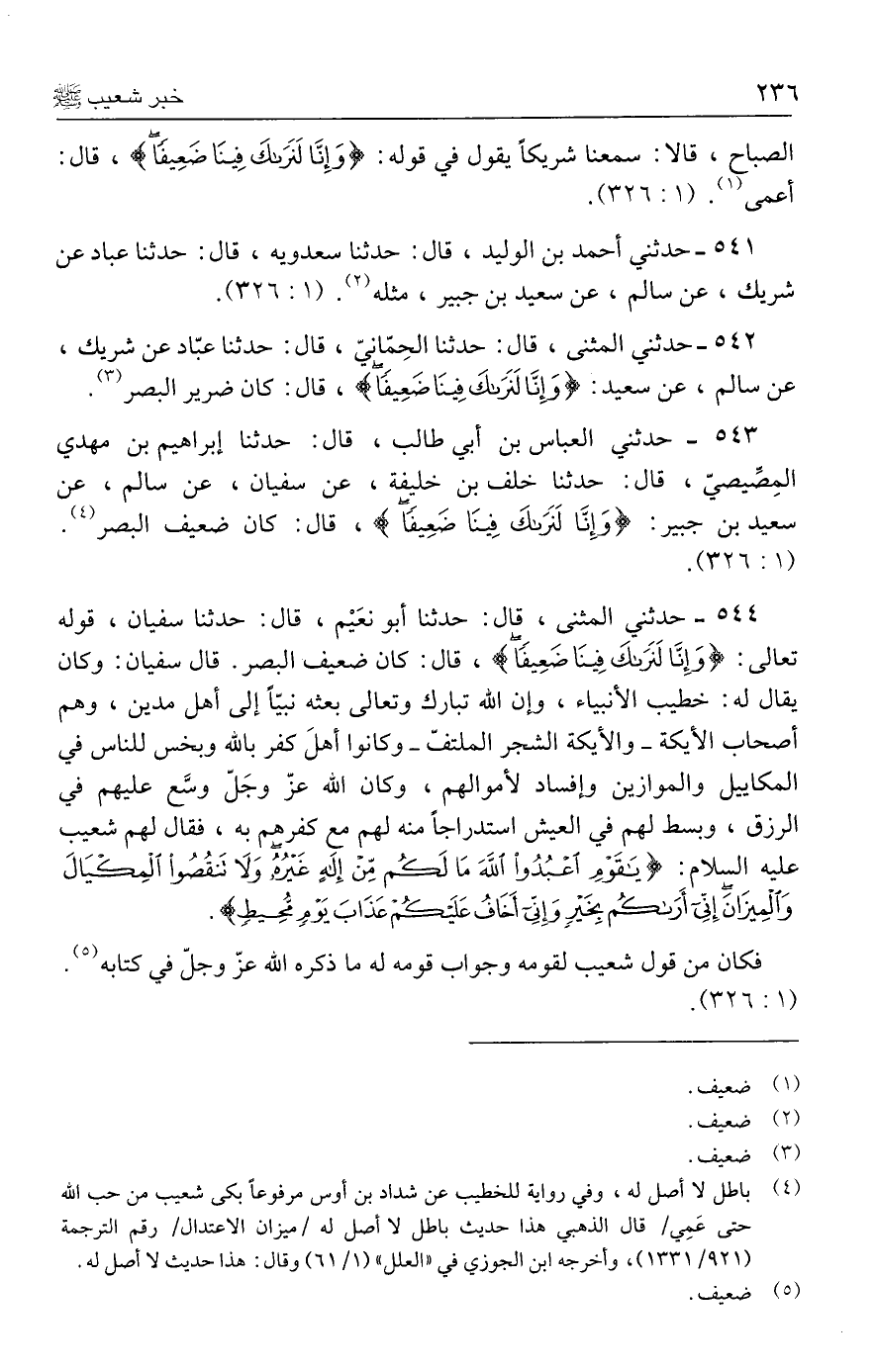 ٥٤٣ - حدثني العباس بن أبي طالب، قال: حدثنا إبراهيم بن مهدي المِصَيصيّ، قال: حدثنا خلف بن خليفة، عن سفيان، عن سالم، عن سعيد بن جبير: {وَإِنَّا لَنَرَاكَ فِينَا ضَعِيفًا}، قال: كان ضعيف البصر (٤). (١: ٣٢٦).