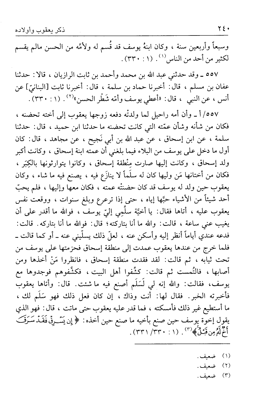 ٥٥٧ - وقد حدثني عبد الله بن محمد وأحمد بن ثابت الرازيان، قالا: حدثنا عفان بن مسلم، قال: أخبرنا حماد بن سلمة، قال: أخبرنا ثابت [البنانيّ] عن أنس، عن النبي، قال: "أعطي يوسف وأمّه شَطْر الحسن" (٢). (١: ٣٣٠).