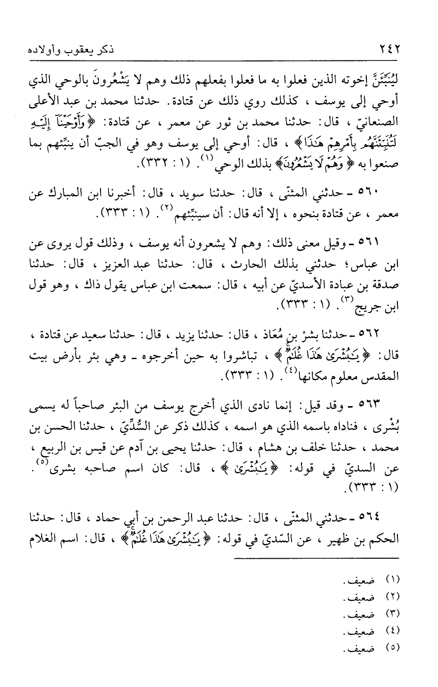 ٥٦٢ - حدثنا بشرْ بن مُعَاذ، قال: حدثنا يزيد، قال: حدثنا سعيد عن قتادة، قال: {يَابُشْرَى هَذَا غُلَامٌ}، تباشروا به حين أخرجوه- وهي بئر بأرض بيت المقدس معلوم مكانها (٤). (١: ٣٣٣).