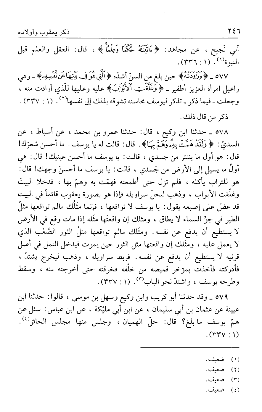 ٥٧٨ - حدثنا ابن وكيع، قال: حدثنا عمرو بن محمد، عن أسباط، عن السديّ: {وَلَقَدْ هَمَّتْ بِهِ وَهَمَّ بِهَا}. قال: قالت له يا يوسف: ما أحسن شعرَك! قال: هو أول ما ينتثر من جسدي، قالت: يا يوسف ما أحسن عينيك! قال: هي أولُ ما يسيل إلى الأرض من جَسدي، قالت: يا يوسف ما أحسنَ وجهك! قال: هو للتراب يأكله، فلم تزل حتى أطمعته فهمّت به وهمّ بها، فدخلا البيتَ وغلّقت الأبواب، وذهب ليحلّ سراويله فإذا هو بصورة يعقوب قائمًا في البيت قد عضّ على إصبعه يقول: يا يوسف لا تواقعها، فإنما مثَلُك ما لم تواقعها مثلُ الطير في جوِّ السماء لا يطاق، ومثلك إن واقعتَها مثَله إذا مات وقع في الأرض لا يستطيع أن يدفع عن نفسه. ومثَلك ما لم تواقعها مثلُ الثور الصَّعْب الذي لا يعمل عليه، ومثَلك إن واقعتها مثل الثور حين يموت فيدخل النمل في أصل قرنيه لا يستطيع أن يدفع عن نفسه. فربط سراويله، وذهب ليخرج يشتدّ، فأدركته فأخذت بمؤخر قميصه من خلْفه فخرقته حتى أخرجته منه، وسقط وطرحه يوسف، واشتدّ نحو الباب (٣). (١: ٣٣٧).