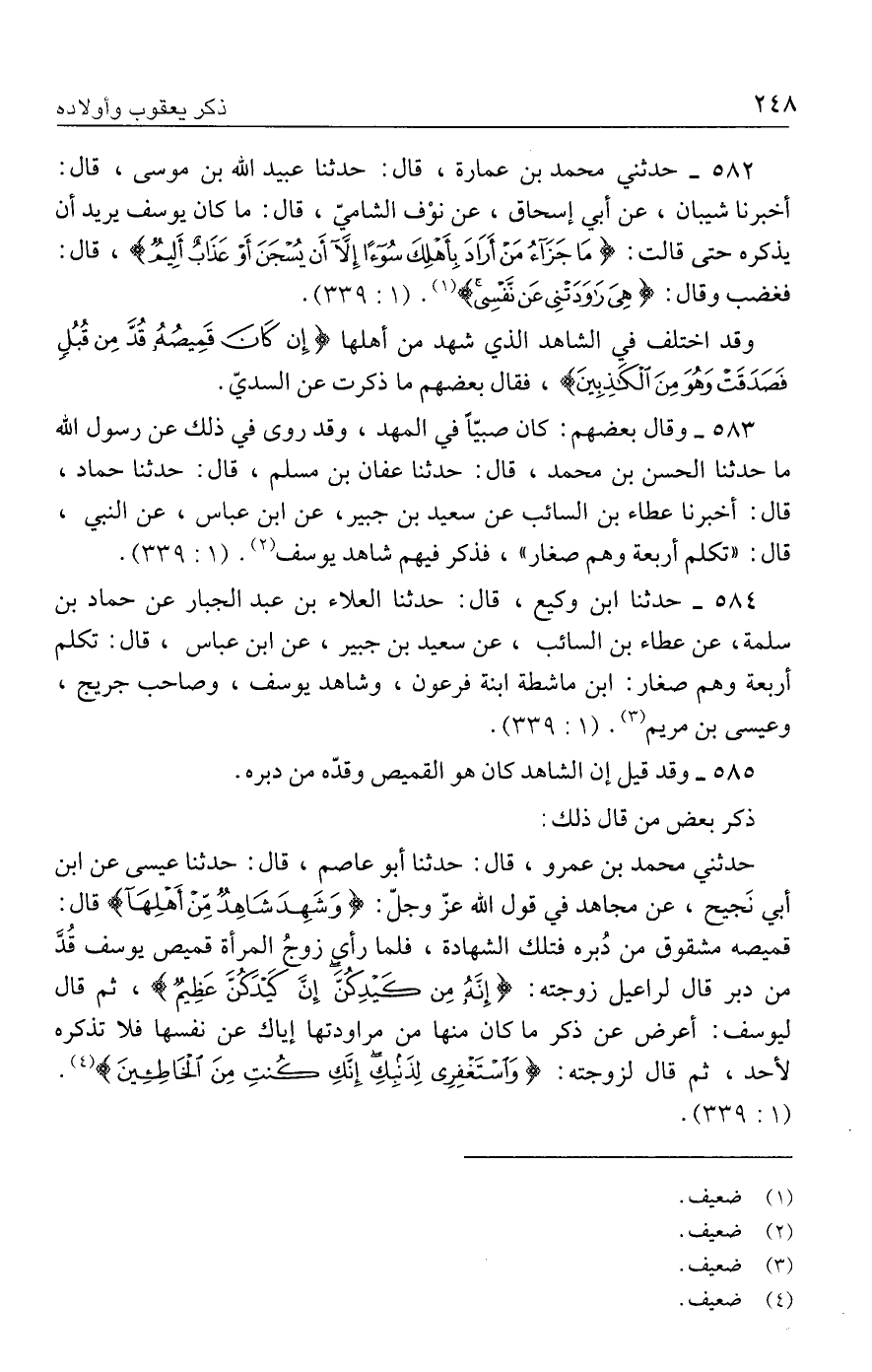 ٥٨٤ - حدثنا ابن وكيع، قال: حدثنا العلاء بن عبد الجبار عن حماد بن سلمة، عن عطاء بن السائب، عن سعيد بن جبير، عن ابن عباس، قال: تكلم أربعة وهم صغار: ابن ماشطة ابنة فرعون، وشاهد يوسف، وصاحب جريج، وعيسى بن مريم (٣). (١: ٣٣٩).