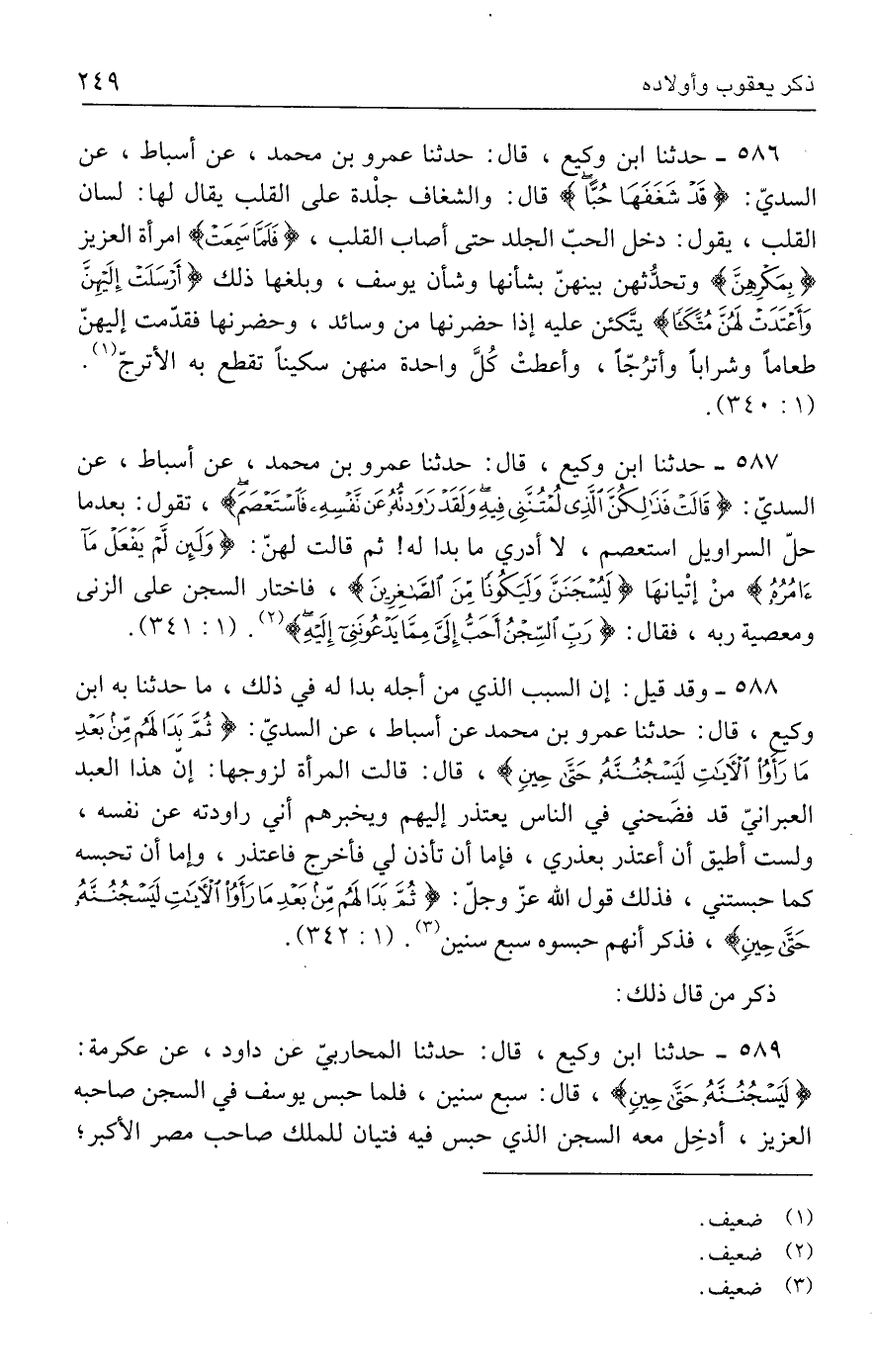 ٥٨٧ - حدثنا ابن وكيع، قال حدثنا عمرو بن محمد، عن أسباط، عن السديّ: {قَالتْ فَذَلِكُنَّ الَّذِي لُمْتُنَّنِي فِيهِ وَلَقَدْ رَاوَدْتُهُ عَنْ نَفْسِهِ فَاسْتَعْصَمَ}، تقول: بعدما حلّ السراويل استعصم، لا أدري ما بدا له! ثم قالت لهنّ: {وَلَئِنْ لَمْ يَفْعَلْ مَا آمُرُهُ} منْ إتْيانهَا {لَيُسْجَنَنَّ وَلَيَكُونًا مِنَ الصَّاغِرِينَ}، فاختار السجن على الزنى ومعصية ربه، فقال: {رَبِّ السِّجْنُ أَحَبُّ إِلَيَّ مِمَّا يَدْعُونَنِي إِلَيهِ} (٢). (١: ٣٤١).