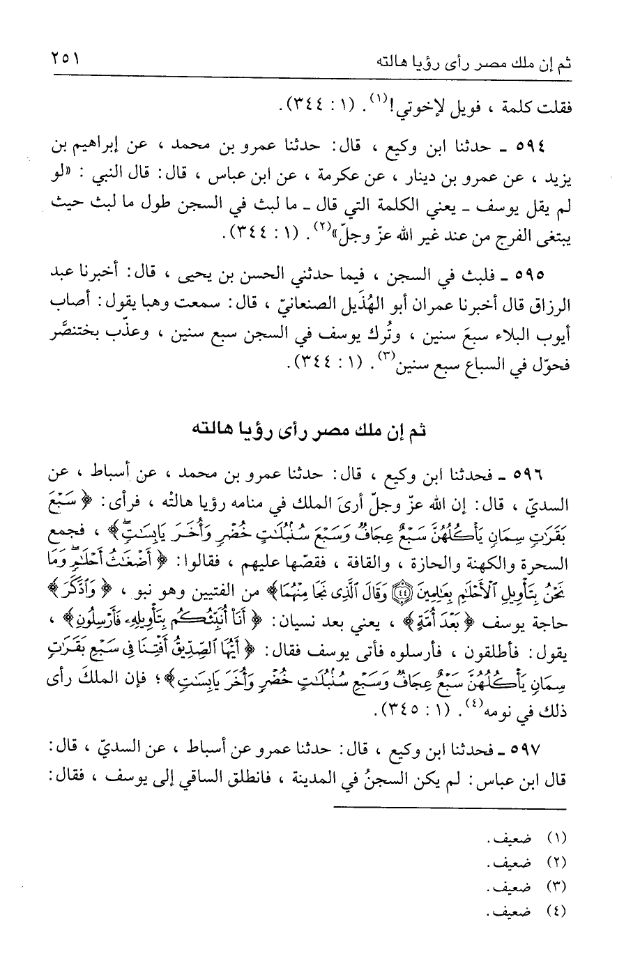 ٥٩٦ - فحدثنا ابن وكيع، قال: حدثنا عمرو بن محمد، عن أسباط، عن السديّ، قال: إن الله عزّ وجلّ أرى الملك في منامه رؤيا هالتْه، فرأى: {سَبْعَ بَقَرَاتٍ سِمَانٍ يَأْكُلُهُنَّ سَبْعٌ عِجَافٌ وَسَبْعَ سُنْبُلَاتٍ خُضْرٍ وَأُخَرَ يَابِسَاتٍ}، فجمع السحرة والكهنة والحازة، والقافة، فقصّها عليهم، فقالوا: {أَضْغَاثُ أَحْلَامٍ وَمَا نَحْنُ بِتَأْويلِ الْأَحْلَامِ بِعَالِمِينَ (٤٤) وَقَال الَّذِي نَجَا مِنْهُمَا} من الفتيين وهو نبو، {وَادَّكَرَ} حاجة يوسف {بَعْدَ أُمَّةٍ}، يعني بعد نسيان: {أَنَا أُنَبِّئُكُمْ بِتَأْويلِهِ فَأَرْسِلُونِ}، يقول: فأطلقون، فأرسلوه فأتى يوسف فقال: {أَيُّهَا الصِّدِّيقُ أَفْتِنَا فِي سَبْعِ بَقَرَاتٍ سِمَانٍ يَأْكُلُهُنَّ سَبْعٌ عِجَافٌ وَسَبْعِ سُنْبُلَاتٍ خُضْرٍ وَأُخَرَ يَابِسَاتٍ}؛ فإن الملكَ رأى ذلك في نومه (٤). (١: ٣٤٥).