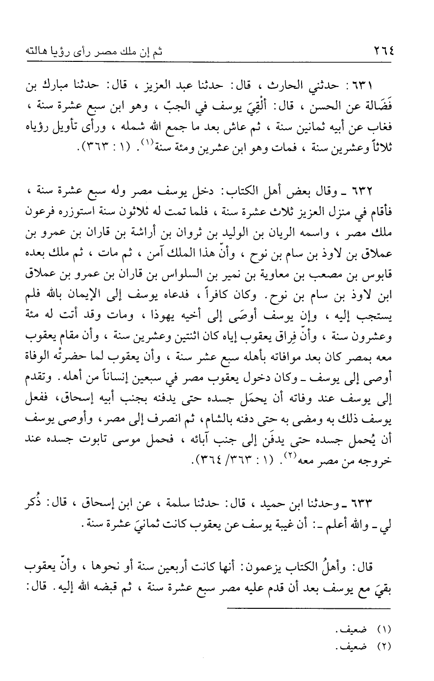 ٦٣١: حدثني الحارث، قال: حدثنا عبد العزيز، قال: حدثنا مبارك بن فَضَالة عن الحسن، قال: ألْقِيَ يوسف في الجبّ، وهو ابن سبع عشرة سنة، فغاب عن أبيه ثمانين سنة، ثم عاش بعد ما جمع الله شمله، ورأى تأويل رؤياه ثلاثًا وعشرين سنة، فمات وهو ابن عشرين ومئة سنة (١). (١: ٣٦٣).