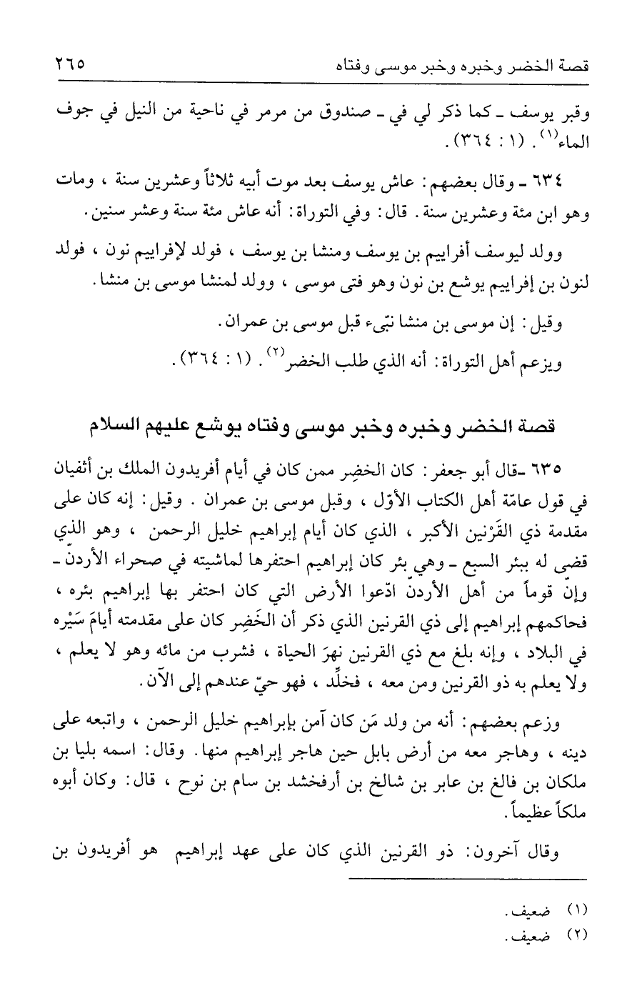 ٦٣٥ - قال أبو جعفر: كان الخضِر ممن كان في أيام أفريدون الملك بن أثفيان في قول عامّة أهل الكتاب الأوّل، وقبل موسى بن عمران. وقيل: إنه كان على مقدمة ذي القَرْنين الأكبر، الذي كان أيام إبراهيم خليل الرحمن، وهو الذي قضى له ببئر السبع -وهي بئر كان إبراهيم احتفرها لماشيته في صحراء الأردنّ- وإنّ قومًا من أهل الأردنّ ادّعوا الأرض التي كان احتفر بها إبراهيم بئره، فحاكمهم إبراهيم إلى ذي القرنين الذي ذكر أن الخَضِر كان على مقدمته أيامَ سَيره في البلاد، وإنه بلغ مع ذي القرنين نهرَ الحياة، فشرب من مائه وهو لا يعلم، ولا يعلم به ذو القرنين ومن معه، فخلِّد، فهو حيّ عندهم إلى الآن.