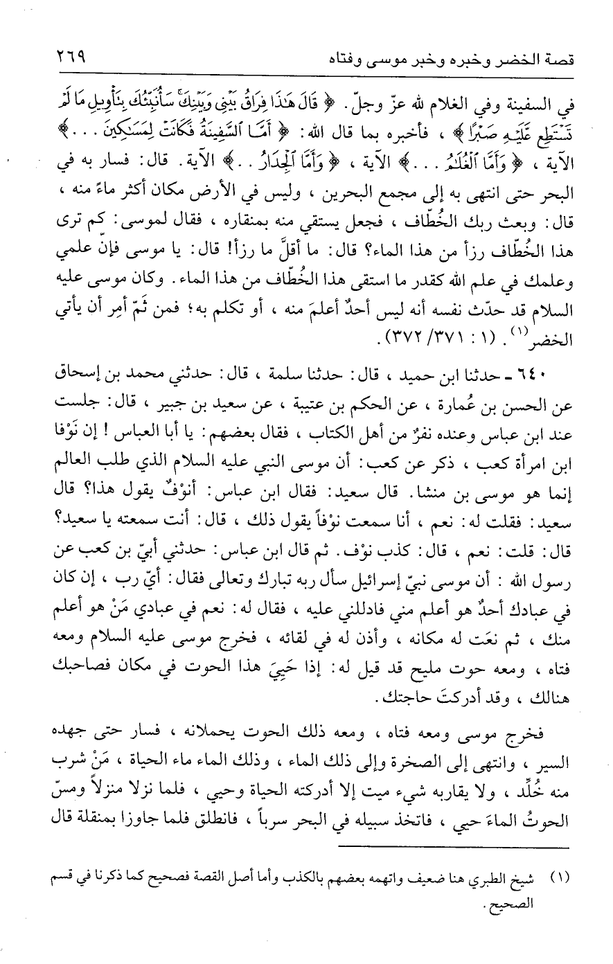 ٦٤٠ - حدثنا ابن حميد، قال: حدثنا سلمة، قال: حدثني محمد بن إسحاق عن الحسن بن عُمارة، عن الحكم بن عتيبة، عن سعيد بن جبير، قال: جلست عند ابن عباس وعنده نفرٌ من أهل الكتاب، فقال بعضهم: يا أبا العباس! إن نَوْفا ابن امرأة كعب، ذكر عن كعب: أن موسى النبي - عليه السلام - الذي طلب العالم إنما هو موسى بن منشا. قال سعيد: فقال ابن عباس: أنوْفٌ يقول هذا؟ قال سعيد: فقلت له: نعم، أنا سمعت نوْفًا يقول ذلك، قال: أنت سمعته يا سعيد؟ قال: قلت: نعم، قال: كذب نوْف. ثم قال ابن عباس: حدثني أبيّ بن كعب عن رسول الله: أن موسى نبيّ إسرائيل سأل ربه تبارك وتعالى فقال: أيّ رب، إن كان في عبادك أحدٌ هو أعلم مني فادللني عليه، فقال له: نعم في عبادي مَنْ هو أعلم منك، ثم نعَت له مكانه، وأذن له في لقائه، فخرج موسى - عليه السلام - ومعه فتاه، ومعه حوت مليح قد قيل له: إذا حَيِيَ هذا الحوت في مكان فصاحبك هنالك، وقد أدركتَ حاجتك.