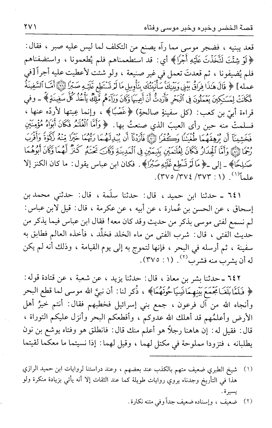 ٦٤١ - حدثنا ابن حميد، قال: حدثنا سلَمة، قال: حدثني محمد بن إسحاق، عن الحسن بن عُمارة، عن أبيه، عن عكرمة، قال: قيل لابن عباس: لم نسمع لفتى موسى بذكر من حديث وقد كان معه! فقال ابن عباس فيما يذكر من حديث الفتى، قال شرب الفتى من ماء الخلد فخلِّد، فأخذه العالم فطابق به سفينة، ثم أرسله في البحر، فإنها لتموج به إلى يوم القيامة، وذلك أنه لم يكن له أن يشرب منه فشرب (٢). (١: ٣٧٥).
