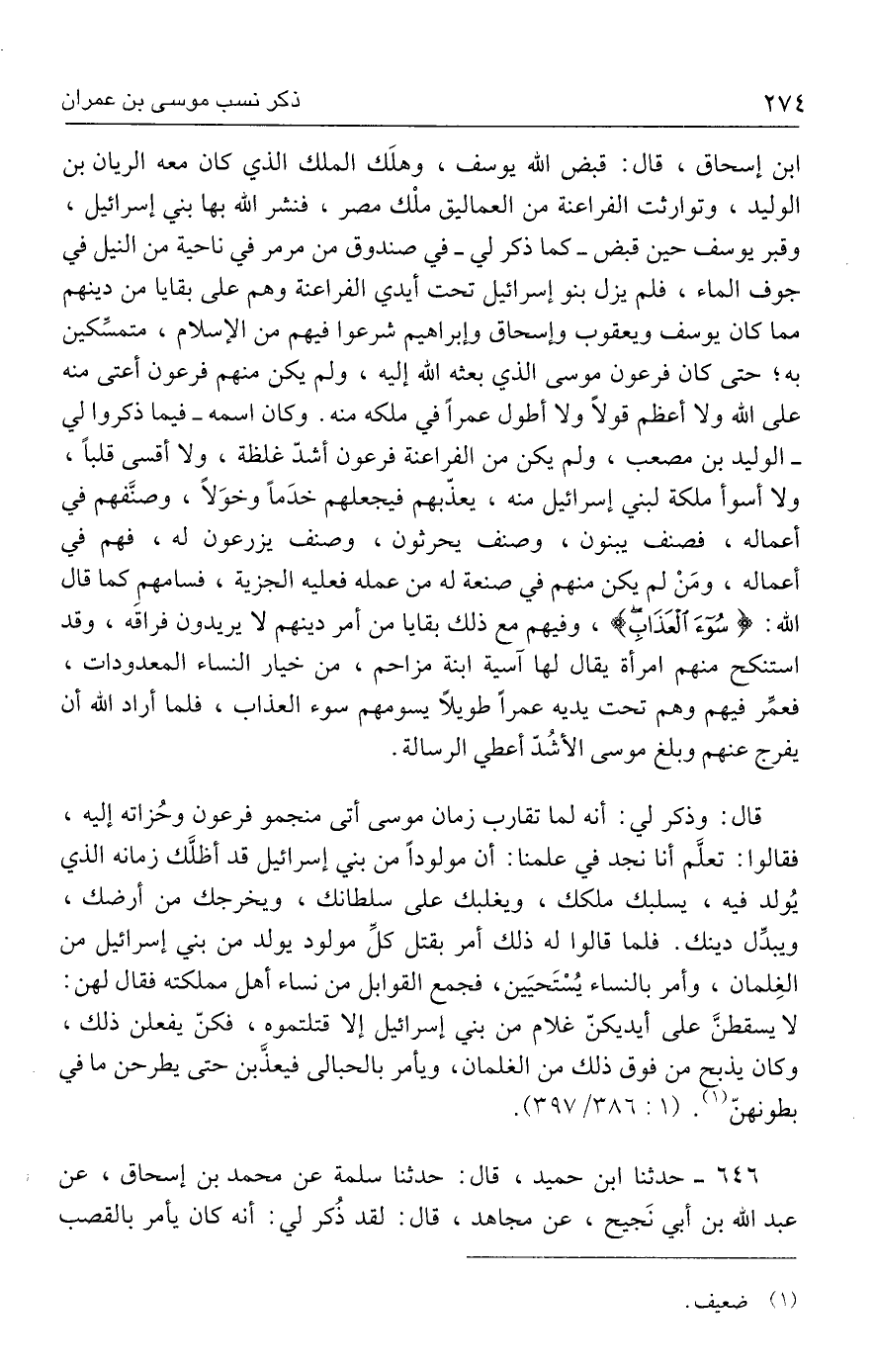 قال: وذكر لي: أنه لما تقارب زمان موسى أتى منجمو فرعون وحُزاته إليه، فقالوا: تعلَّم أنا نجد في علمنا: أن مولودًا من بني إسرائيل قد أظلَّك زمانه الذي يُولد فيه، يسلبك ملكك، ويغلبك على سلطانك، ويخرجك من أرضك، ويبدِّل دينك. فلما قالوا له ذلك أمر بقتل كلِّ مولود يولد من بني إسرائيل من الغِلمان، وأمر بالنساء يُسْتَحيَين، فجمع القوابل من نساء أهل مملكته فقال لهن: لا يسقطنَّ على أيديكنّ غلام من بني إسرائيل إلا قتلتموه، فكنّ يفعلن ذلك، وكان يذبح من فوق ذلك من الغلمان، ويأمر بالحبالى فيعذَّبن حتى يطرحن ما في بطونهنّ (١). (١: ٣٨٦/ ٣٩٧).