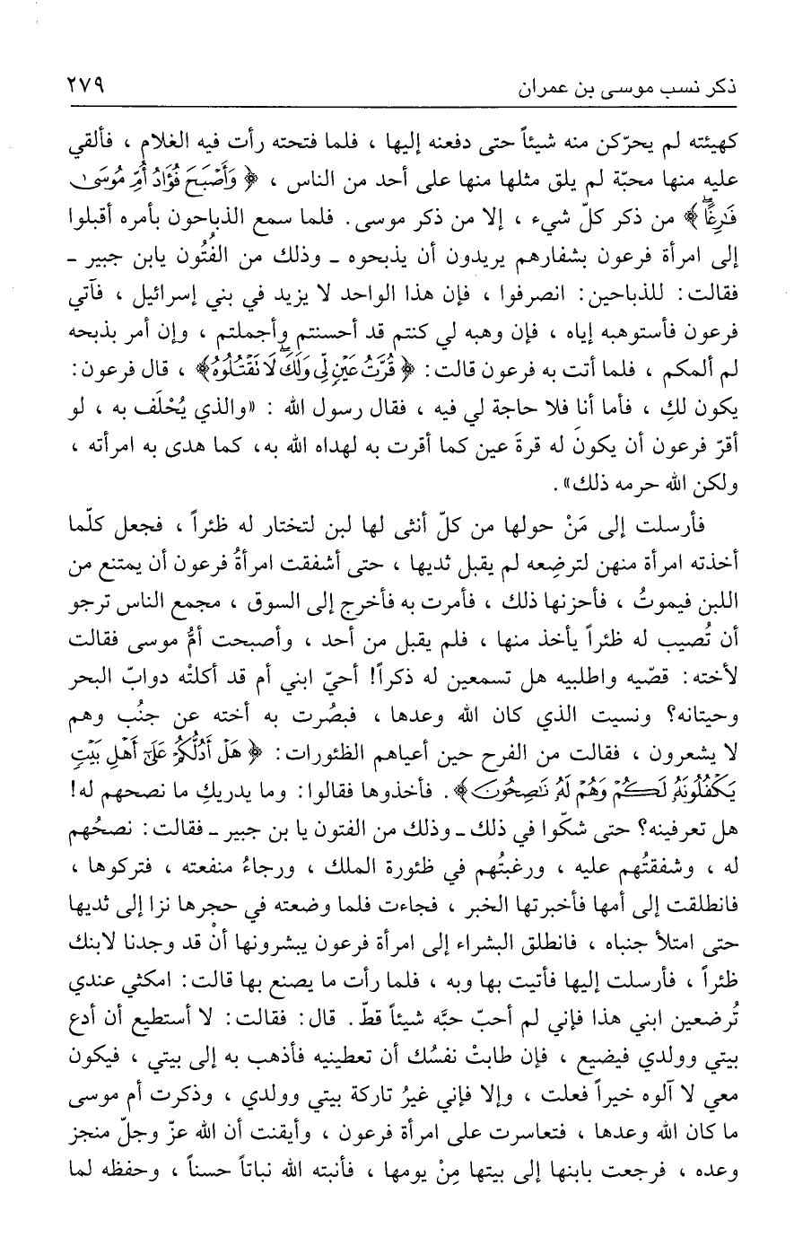 فأرسلت إلى مَنْ حولها من كلّ أنثى لها لبن لتختار له ظئرًا، فجعل كلّما أخذته امرأة منهن لترضِعه لم يقبل ثديها، حتى أشفقت امرأةُ فرعون أن يمتنع من اللبن فيموتُ، فأحزنها ذلك، فأمرت به فأخرج إلى السوق، مجمع الناس ترجو أن تُصيب له ظئرًا يأخذ منها، فلم يقبل من أحد، وأصبحت أمُّ موسى فقالت لأخته: قصّيه واطلبيه هل تسمعين له ذكرًا! أحيّ ابني أم قد أكلتْه دوابّ البحر وحيتانه؟ ونسيت الذي كان الله وعدها، فبصُرت به أخته عن جنُب وهم لا يشعرون، فقالت من الفرح حين أعياهم الظئورات: {هَلْ أَدُلُّكُمْ عَلَى أَهْلِ بَيتٍ يَكْفُلُونَهُ لَكُمْ وَهُمْ لَهُ نَاصِحُونَ}. فأخذوها فقالوا: وما يدريكِ ما نصحهم له! هل تعرفينه؟ حتى شكّوا في ذلك -وذلك من الفتون يا بن جبير- فقالت: نصحُهم له، وشفقتُهم عليه، ورغبتُهم في ظئورة الملك، ورجاءُ منفعته، فتركوها، فانطلقت إلى أمها فأخبرتها الخبر، فجاءت فلما وضعته في حجرها نزا إلى ثديها حتى امتلأ جنباه، فانطلق البشراء إلى امرأة فرعون يبشرونها أنْ قد وجدنا لابنك ظئرًا، فأرسلت إليها فأتيت بها وبه، فلما رأت ما يصنع بها قالت: امكثي عندي تُرضعين ابني هذا فإني لم أحبّ حبَّه شيئًا قطّ. قال: فقالت: لا أستطيع أن أدع بيتي وولدي فيضيع، فإن طابتْ نفسُك أن تعطينيه فأذهب به إلى بيتي، فيكون معي لا آلوه خيرًا فعلت، وإلا فإني غيرُ تاركة بيتي وولدي، وذكرت أم موسى ما كان الله وعدها، فتعاسرت على امرأة فرعون، وأيقنت أن الله عزّ وجلّ منجز وعده، فرجعت بابنها إلى بيتها مِنْ يومها، فأنبته الله نباتًا حسنًا، وحفظه لما