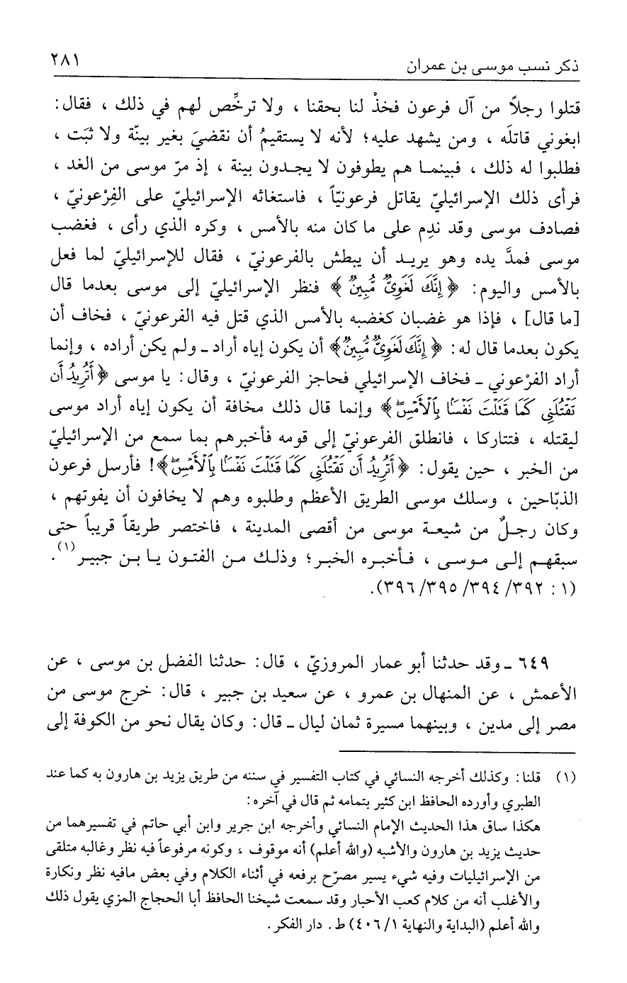 ٦٤٩ - وقد حدثنا أبو عمار المروزيّ، قال: حدثنا الفضل بن موسى، عن الأعمش، عن المنهال بن عمرو، عن سعيد بن جبير، قال: خرج موسى من مصر إلى مدين، وبينهما مسيرة ثمان ليال -قال: وكان يقال نحو من الكوفة إلى