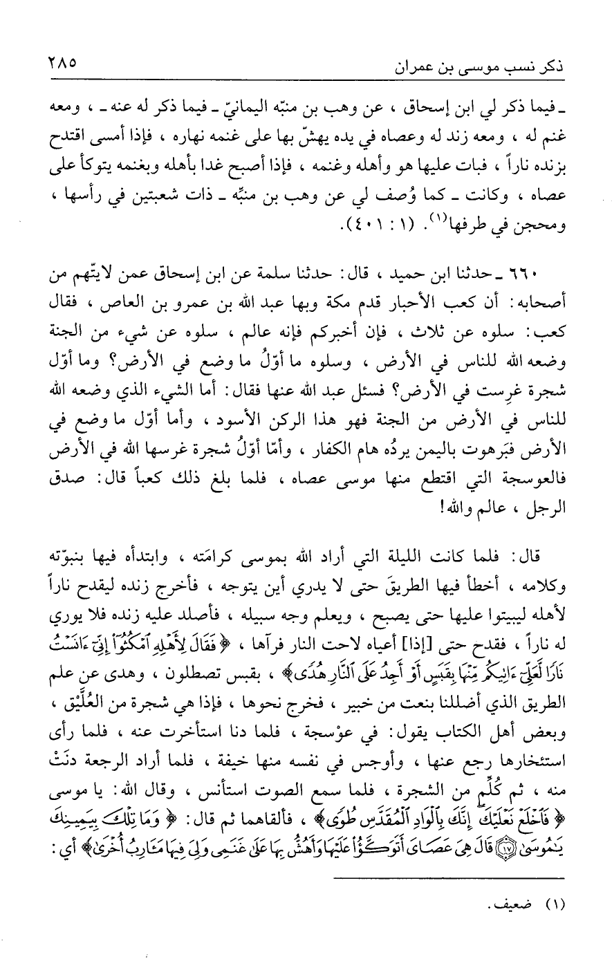 - فيما ذكر لي ابن إسحاق، عن وهب بن منبّه اليمانيّ -فيما ذكر له عنه-، ومعه غنم له، ومعه زند له وعصاه في يده يهشّ بها على غنمه نهاره، فإذا أمسى اقتدح بزنده نارًا، فبات عليها هو وأهله وغنمه، فإذا أصبح غدا بأهله وبغنمه يتوكأ على عصاه، وكانت -كما وُصف لي عن وهب بن منبِّه- ذات شعبتين في رأسها، ومحجن في طرفها (١). (١: ٤٠١).