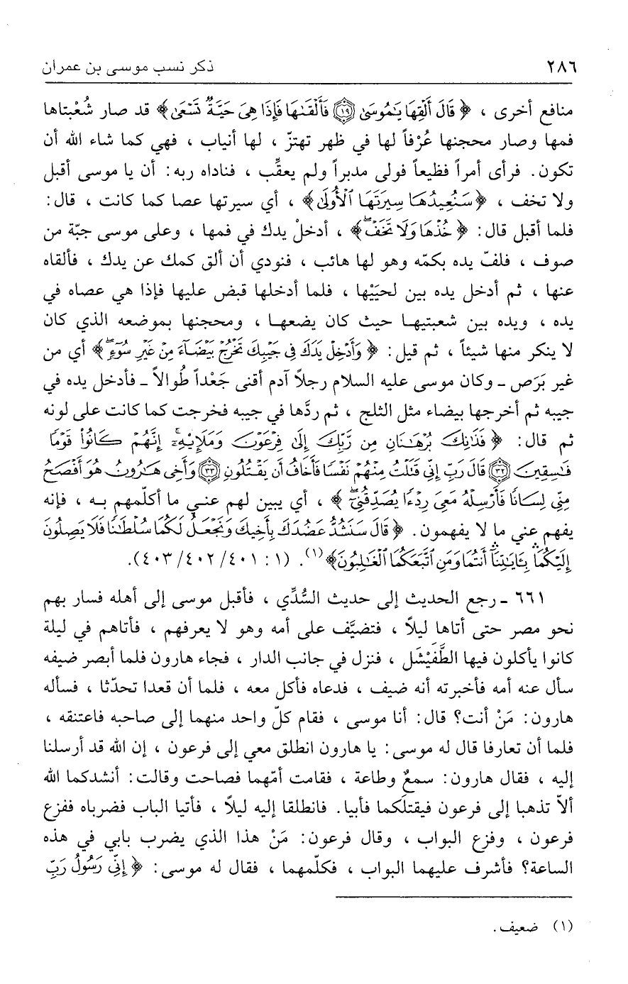 ٦٦١ - رجع الحديث إلى حديث السُّدِّي، فأقبل موسى إلى أهله فسار بهم نحو مصر حتى أتاها ليلًا، فتضيَّف على أمه وهو لا يعرفهم، فأتاهم في ليلة كانوا يأكلون فيها الطَّفَيشَل، فنزل في جانب الدار، فجاء هارون فلما أبصر ضيفه سأل عنه أمه فأخبرته أنه ضيف، فدعاه فأكل معه، فلما أن قعدا تحدّثا، فسأله هارون: مَن أنت؟ قال: أنا موسى، فقام كلّ واحد منهما إلى صاحبه فاعتنقه، فلما أن تعارفا قال له موسى: يا هارون انطلق معي إلى فرعون، إن الله قد أرسلنا إليه، فقال هارون: سمعٌ وطاعة، فقامت أمّهما فصاحت وقالت: أنشدكما الله ألّا تذهبا إلى فرعون فيقتلَكما فأبيا. فانطلقا إليه ليلًا، فأتيا الباب فضرباه ففزع فرعون، وفزع البواب، وقال فرعون: مَنْ هذا الذي يضرب بابي في هذه الساعة؟ فأشرف عليهما البواب، فكلّمهما، فقال له موسى: {إِنِّي رَسُولُ رَبِّ