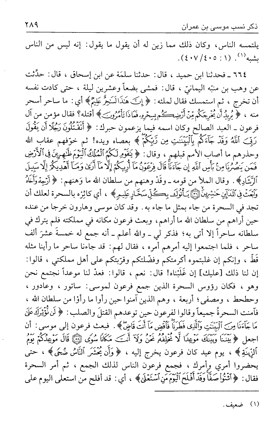 ٦٦٤ - فحدثنا ابن حميد، قال: حدثنا سلمَة عن ابن إسحاق، قال: حدِّثت عن وهب بن منبّه اليمانيّ، قال: فمشى بضعًا وعشرين ليلة، حتى كادت نفسه أن تخرج، ثم استمسك فقال لملئه: {إِنَّ هَذَا لَسَاحِرٌ عَلِيمٌ} أي: ما ساحر أسحر منه، {يُرِيدُ أَنْ يُخْرِجَكُمْ مِنْ أَرْضِكُمْ بِسِحْرِهِ فَمَاذَا تَأْمُرُونَ} أقتله؟ فقال مؤمن من آل فرعون- العبد الصالح وكان اسمه فيما يزعمون حبرك: {أَتَقْتُلُونَ رَجُلًا أَنْ يَقُولَ رَبِّيَ اللَّهُ وَقَدْ جَاءَكُمْ بِالْبَيِّنَاتِ مِنْ رَبِّكُمْ} بعصاه ويده! ثم خوّفهم عقاب الله وحذرهم ما أصاب الأمم قبلهم، وقال: {يَاقَوْمِ لَكُمُ الْمُلْكُ الْيَوْمَ ظَاهِرِينَ فِي الْأَرْضِ فَمَنْ يَنْصُرُنَا مِنْ بَأْسِ اللَّهِ إِنْ جَاءَنَا قَال فِرْعَوْنُ مَا أُرِيكُمْ إلا مَا أَرَى وَمَا أَهْدِيكُمْ إلا سَبِيلَ الرَّشَادِ}. وقال الملأ من قومه- وقَدْ وهنهم من سلطان الله ما وَهنهم: {أَرْجِهْ وَأَخَاهُ وَابْعَثْ فِي الْمَدَائِنِ حَاشِرِينَ (٣٦) يَأْتُوكَ بِكُلِّ سَحَّارٍ عَلِيمٍ}، أي كاثِره بالسحرة لعلك أن تجد في السحرة من جاء بمثل ما جاء به. وقد كان موسى وهارون خرجا من عنده حين أراهم من سلطان الله ما أراهم، وبعث فرعون مكانه في مملكته فلم يترك في سلطانه ساحرًا إلا أتى به؛ فذكر لي -والله أعلم- أنه جمع له خمسةَ عشرَ ألف ساحر، فلما اجتمعوا إليه أمرهم أمره، فقال لهم: قد جاءنا ساحر ما رأينا مثله قَطّ، وإنكم إن غلبتموه أكرمتكم وفضّلتكم وقرّبتكم على أهل مملكتي، قالوا: إن لنا ذلك [عليك] إن غَلَبْناه! قال: نعم، قالوا: فعدْ لنا موعدًا نجتمع نحن وهو، فكان رؤوس السحرة الذين جمع فرعون لموسى: ساتور، وعادور، وحطحط، ومصفى؛ أربعة، وهم الذين آمنوا حين رأوا ما رأوْا من سلطان الله، فآمنت السحرةُ جميعًا وقالوا لفرعون حين توعدهم القتلَ والصلب: {قَالُوا لَنْ نُؤْثِرَكَ عَلَى مَا جَاءَنَا مِنَ الْبَيِّنَاتِ وَالَّذِي فَطَرَنَا فَاقْضِ مَا أَنْتَ قَاضٍ}. فبعث فرعون إلى موسى: أن اجعل {بَينَنَا وَبَينَكَ مَوْعِدًا لَا نُخْلِفُهُ نَحْنُ وَلَا أَنْتَ مَكَانًا سُوًى (٥٨) قَال مَوْعِدُكُمْ يَوْمُ الزِّينَةِ}، يوم عيد كان فرعون يخرج إليه، {وَأَنْ يُحْشَرَ النَّاسُ ضُحًى}، حتى يحضروا أمري وأمرك، فجمع فرعون الناس لذلك الجمع، ثم أمر السحرة فقال: {ائْتُوا صَفًّا وَقَدْ أَفْلَحَ الْيَوْمَ مَنِ اسْتَعْلَى}، أي: قد أفلح من استعلى اليوم على