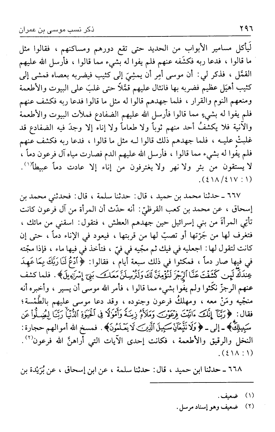٦٦٧ - حدثنا محمد بن حميد، قال: حدثنا سلمة، قال: فحدثني محمد بن إسحاق، عن محمد بن كعب القرظيّ: أنه حدّث أن المرأة من آل فرعون كانت تأتِي المرأةَ من بني إسرائيل حين جهدهم العطش، فتقول: اسقني من مائك، فتغرف لها من جَرّتها أو تصبّ لها من قربتها، فيعود في الإناء دمًا، حتى إن كانت لتقول لها: اجعليه في فيك ثم مجّيه في في، فتأخذ في فيها ماء، فإذا مجّته في فيها صار دمًا، فمكثوا في ذلك سبعة أيام، فقالوا: {ادْعُ لَنَا رَبَّكَ بِمَا عَهِدَ عِنْدَكَ لَئِنْ كَشَفْتَ عَنَّا الرِّجْزَ لَنُؤْمِنَنَّ لَكَ وَلَنُرْسِلَنَّ مَعَكَ بَنِي إِسْرَائِيلَ}. فلما كشف عنهم الرجز نكَثوا ولم يفوا بشيء مما قالوا، فأمر الله موسى أن يسير، وأخبره أنه منجّيه ومَنْ معه، ومهلكُ فرعون وجنوده، وقد دعا موسى عليهم بالطمْسة؛ فقال: {رَبَّنَا إِنَّكَ آتَيتَ فِرْعَوْنَ وَمَلَأَهُ زِينَةً وَأَمْوَالًا فِي الْحَيَاةِ الدُّنْيَا رَبَّنَا لِيُضِلُّوا عَنْ سَبِيلِكَ} -إلى- {وَلَا تَتَّبِعَانِّ سَبِيلَ الَّذِينَ لَا يَعْلَمُونَ}. فمسخ الله أموالهم حجارة: النخل والرقيق والأطعمة، فكانت إحدى الآيات التي أراهنَّ الله فرعون (٢). (٤١٨: ١).