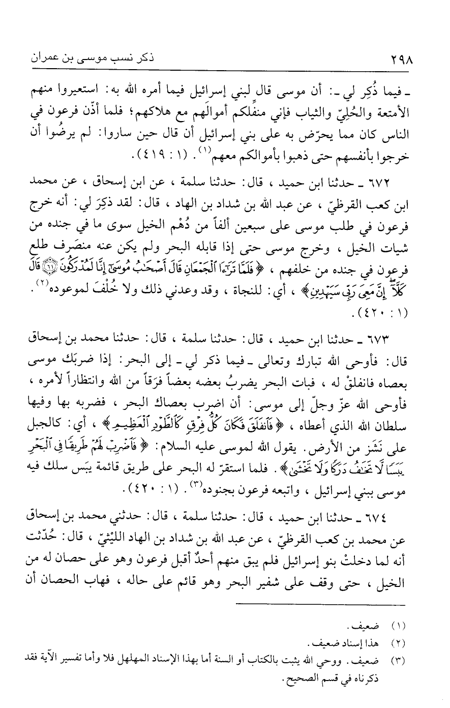 ٦٧٢ - حدثنا ابن حميد، قال: حدثنا سلمة، عن ابن إسحاق، عن محمد بن كعب القرظيّ، عن عبد الله بن شداد بن الهاد، قال: لقد ذكِرَ لي: أنه خرج فرعون في طلب موسى على سبعين ألفًا من دُهْم الخيل سوى ما في جنده من شيات الخيل، وخرج موسى حتى إذا قابله البحر ولم يكن عنه منصَرف طلع فرعون في جنده من خلفهم، {فَلَمَّا تَرَاءَى الْجَمْعَانِ قَال أَصْحَابُ مُوسَى إِنَّا لَمُدْرَكُونَ (٦١) قَال كَلَّا إِنَّ مَعِيَ رَبِّي سَيَهْدِينِ}، أي: للنجاة، وقد وعدني ذلك ولا خُلْفَ لموعوده (٢). (١: ٤٢٠).