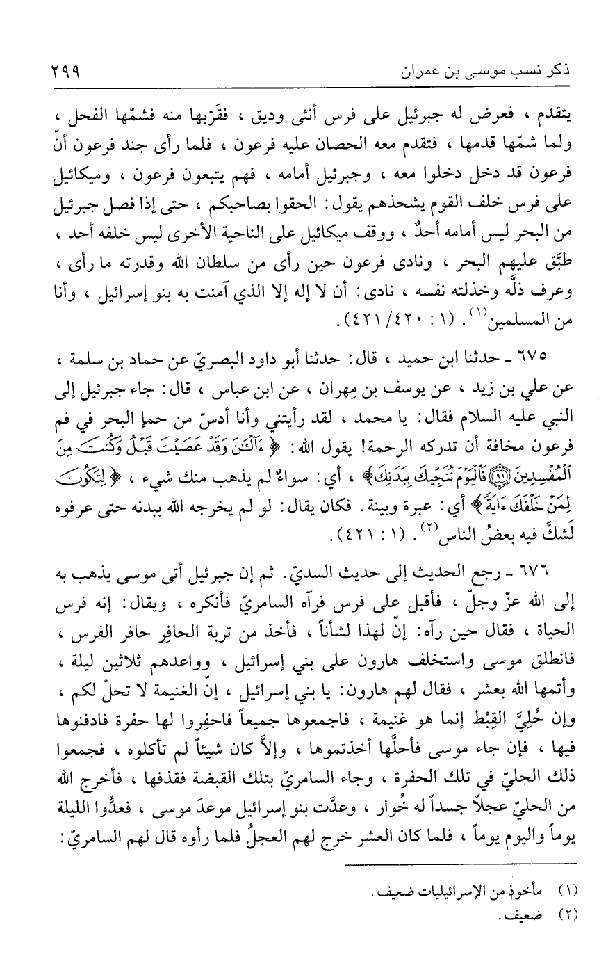 ٦٧٥ - حدثنا ابن حميد، قال: حدثنا أبو داود البصريّ عن حماد بن سلمة، عن علي بن زيد، عن يوسف بن مِهران، عن ابن عباس، قال: جاء جبرئيل إلى النبي - عليه السلام - فقال: يا محمد، لقد رأيتني وأنا أدسّ من حمإ البحر في فم فرعون مخافة أن تدركه الرحمة! يقول الله: {آلْآنَ وَقَدْ عَصَيتَ قَبْلُ وَكُنْتَ مِنَ الْمُفْسِدِينَ (٩١) فَالْيَوْمَ نُنَجِّيكَ بِبَدَنِكَ}، أي: سواءٌ لم يذهب منك شيء، {لِتَكُونَ لِمَنْ خَلْفَكَ آيَةً} أي: عبرة وبينة. فكان يقال: لو لم يخرجه الله ببدنه حتى عرفوه لَشكَّ فيه بعضُ الناس (٢). (١: ٤٢١).