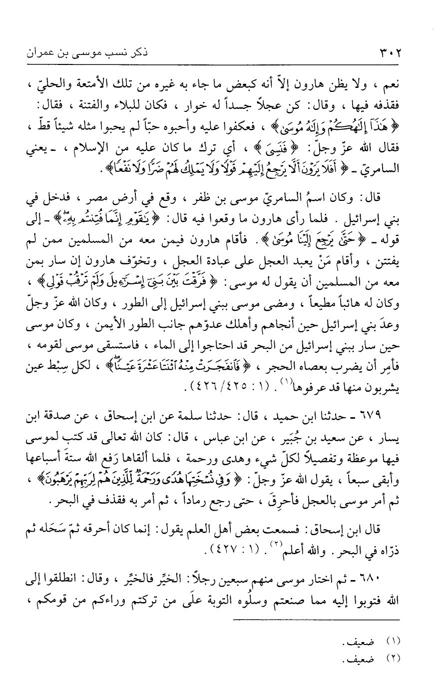 ٦٧٩ - حدثنا ابن حميد، قال: حدثنا سلمة عن ابن إسحاق، عن صدقة ابن يسار، عن سعيد بن جُبَير، عن ابن عباس، قال: كان الله تعالى قد كتب لموسى فيها موعظة وتفصيلًا لكلّ شيء وهدى ورحمة، فلما ألقاها رَفع الله ستةَ أسباعها وأبقى سبعًا، يقول الله عزّ وجلّ: {وَفِي نُسْخَتِهَا هُدًى وَرَحْمَةٌ لِلَّذِينَ هُمْ لِرَبِّهِمْ يَرْهَبُونَ}، ثم أمر موسى بالعجل فأحرِقَ، حتى رجع رمادًا، ثم أمر به فقذف في البحر.