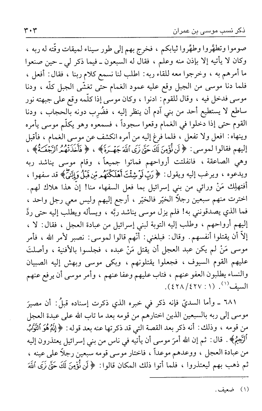 صوموا وتطهَّروا وطهِّروا ثيابكم، فخرج بهم إلى طور سيناء لميقات وقّته له ربه، وكان لا يأتيه إلا بإذن منه وعلم، فقال له السبعون -فيما ذكر لي- حين صنعوا ما أمرهم به، وخرجوا معه للقاء ربه: اطلب لنا نسمع كلام ربنا، فقال: أفعل، فلما دنا موسى من الجبل وقع عليه عمود الغمام حتى تغشّى الجبل كلّه، وفي نا موسى فدخل فيه، وقال للقوم: ادنوا، وكان موسى إذا كلّمه وقع على جبهته نور ساطع لا يستطيع أحد من بني آدم أن ينظر إليه، فضُرِب دونه بالحجاب، ودنا القوم حتى إذا دخلوا في الغمام وقعوا سجودًا، فسمعوه وهو يكلّم موسى يأمره وينهاه: افعل ولا تفعل، فلما فرغ إليه من أمره انكشف عن موسى الغمام، فأقبل إليهم فقالوا لموسى: {لَنْ نُؤْمِنَ لَكَ حَتَّى نَرَى اللَّهَ جَهْرَةً}، {فَأَخَذَتْهُمُ الرَّجْفَةُ}، وهي الصاعقة، فانفلتت أرواحهم فماتوا جميعًا، وقام موسى يناشد ربه ويدعوه، ويرغب إليه ويقول: {رَبِّ لَوْ شِئْتَ أَهْلَكْتَهُمْ مِنْ قَبْلُ وَإِيَّايَ} قد سفهوا، أفتهلِك مَنْ ورائي من بني إسرائيل بما فعل السفهاء منا! إن هذا هلاك لهم. اخترت منهم سبعين رجلًا الخيّر فالخيّر، أرجع إليهم وليس معي رجل واحد، فما الذي يصدقونني به! فلم يزل موسى يناشد ربَّه، ويسأله ويطلب إليه حتى ردَّ إليهم أرواحهم، وطلب إليه التوبة لبني إسرائيل من عبادة العجل، فقال: لا، إلّا أن يقتلوا أنفسهم. وقال: فبلغني: أنّهم قالوا لموسى: نصبر لأمر الله، فأمر موسى مَنْ لم يكن عبد العجل أن يقتل مَنْ عبده، فجلسوا بالأفنية، وأصلتَ عليهم القوم السيوف، فجعلوا يقتلونهم، وبكى موسى وبهش إليه الصبيان والنساء يطلبون العفو عنهم، فتاب عليهم وعفا عنهم، وأمر موسى أن يرفع عنهم السيف (١). (١: ٤٢٧/ ٤٢٨).