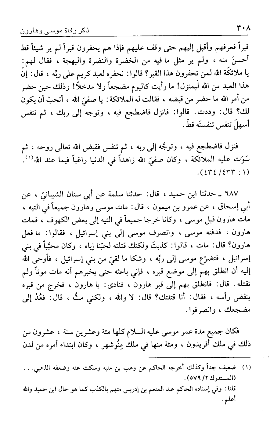 ٦٨٧ - حدثنا ابن حميد، قال: حدثنا سلمة عن أبي سنان الشيبانى، عن أبي إسحاق، عن عمرو بن ميمون، قال: مات موسى وهارون جميعًا في التيه، مات هارون قبل موسى، وكانا خرجا جميعًا في التيه إلى بعض الكهوف، فمات هارون، فدفنه موسى، وانصرف موسى إلى بني إسرائيل، فقالوا: ما فعل هارون؟ قال: مات، قالوا: كذبتَ ولكنك قتلته لحبّنا إياه، وكان محبَّبًا في بني إسرائيل، فتضرّع موسى إلى ربِّه، وشكا ما لقيَ من بني إسرائيل، فأوحى الله إليه أن انطلق بهم إلى موضع قبره، فإني باعثه حتى يخبرهم أنه مات موتًا ولم تقتله. قال: فانطلق بهم إلى قبر هارون، فنادى: يا هارون، فخرج من قبره ينفض رأسه، فقال: أنا قتلتك؟ قال: لا والله، ولكني متُّ، قال: فعُدْ إلى مضجعك، وانصرفوا.