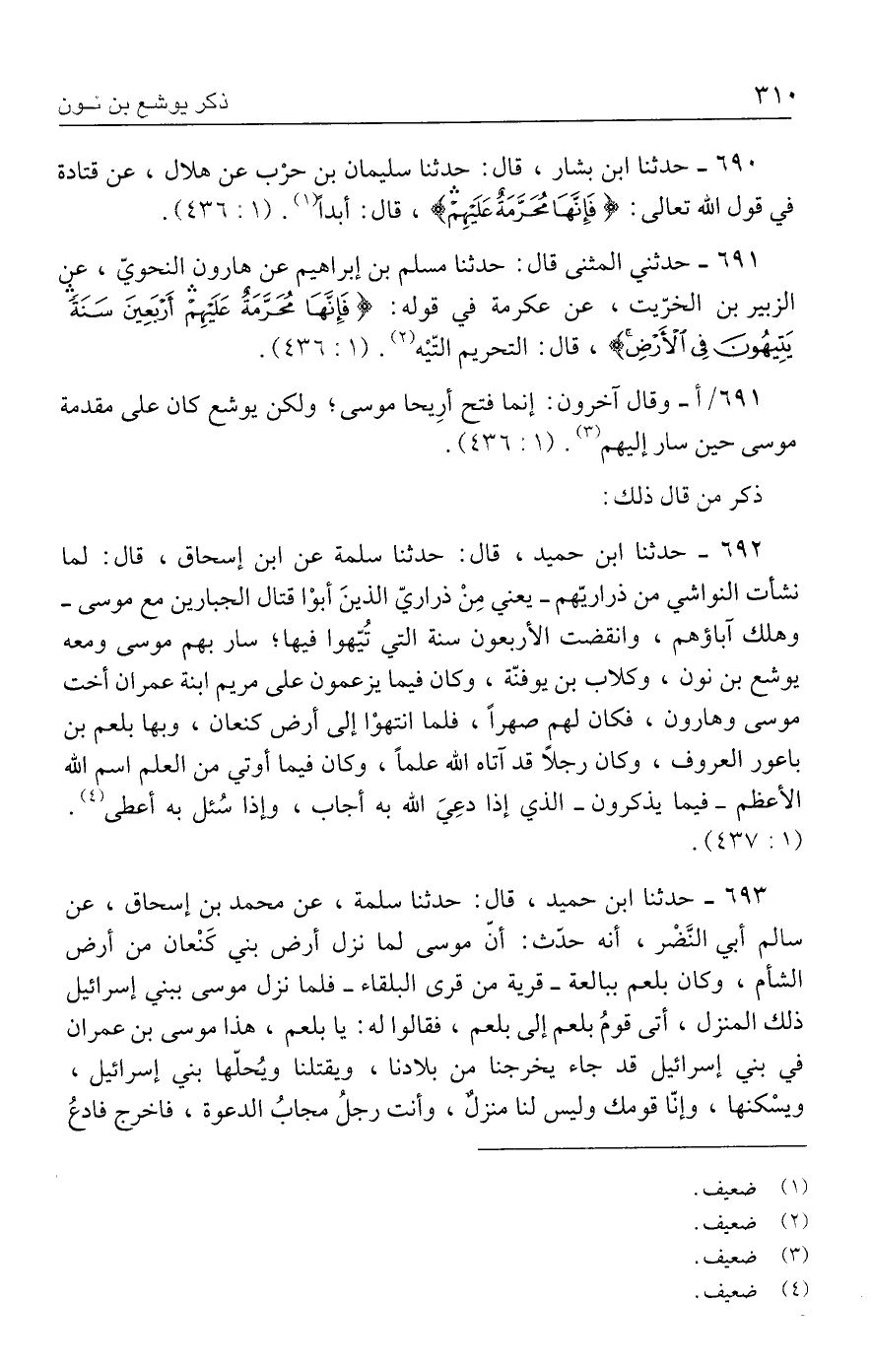 ٦٩٢ - حدثنا ابن حميد، قال: حدثنا سلمة عن ابن إسحاق، قال: لما نشأت النواشي من ذراريّهم -يعني مِنْ ذراريّ الذينَ أبوْا قتال الجبارين مع موسى- وهلك آباؤهم، وانقضت الأربعون سنة التي تُيّهوا فيها؛ سار بهم موسى ومعه يوشع بن نون، وكلاب بن يوفنّة، وكان فيما يزعمون على مريم ابنة عمران أخت موسى وهارون، فكان لهم صهرًا، فلما انتهوْا إلى أرض كنعان، وبها بلعم بن باعور المعروف، وكان رجلًا قد آتاه الله علمًا، وكان فيما أوتي من العلم اسم الله الأعظم -فيما يذكرون- الذي إذا دعِيَ الله به أجاب، وإذا سُئل به أعطى (٤). (٤٣٧: ١).