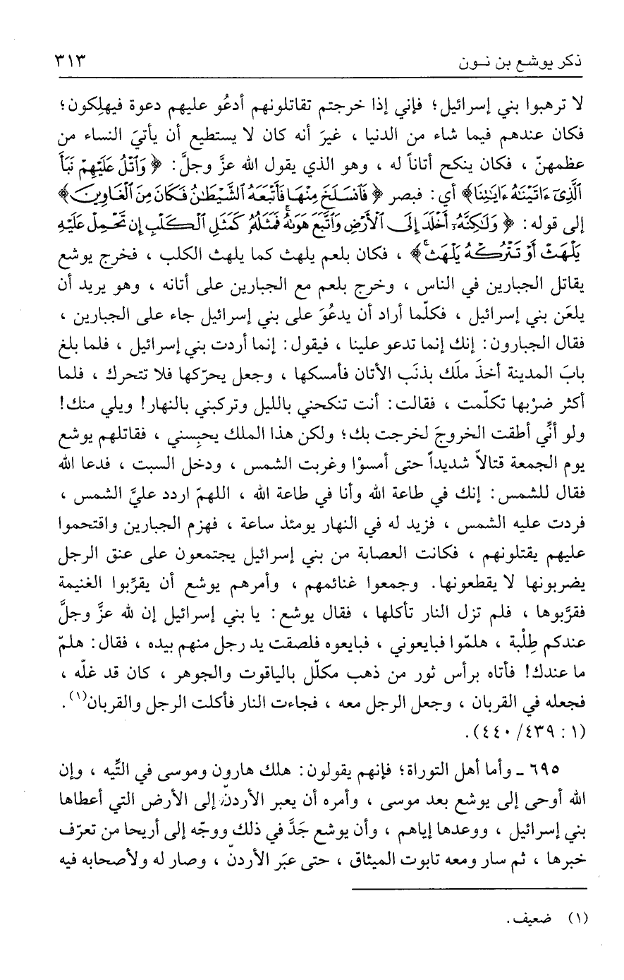 لا ترهبوا بني إسرائيل؛ فإني إذا خرجتم تقاتلونهم أدعُو عليهم دعوة فيهلِكون؛ فكان عندهم فيما شاء من الدنيا، غيرَ أنه كان لا يستطيع أن يأتيَ النساء من عظمهنّ، فكان ينكح أتانًا له، وهو الذي يقول الله عزَّ وجلَّ: {وَاتْلُ عَلَيهِمْ نَبَأَ الَّذِي آتَينَاهُ آيَاتِنَا} أي: فبصر {فَانْسَلَخَ مِنْهَا فَأَتْبَعَهُ الشَّيطَانُ فَكَانَ مِنَ الْغَاوين} إلى قوله: {وَلَكِنَّهُ أَخْلَدَ إِلَى الْأَرْضِ وَاتَّبَعَ هَوَاهُ فَمَثَلُهُ كَمَثَلِ الْكَلْبِ إِنْ تَحْمِلْ عَلَيهِ يَلْهَثْ أَوْ تَتْرُكْهُ يَلْهَثْ}، فكان بلعم يلهث كما يلهث الكلب، فخرج يوشع يقاتل الجبارين في الناس، وخرج بلعم مع الجبارين على أتانه، وهو يريد أن يلعَن بني إسرائيل، فكلّما أراد أن يدعُوَ علي بني إسرائيل جاء على الجبارين، فقال الجبارون: إنك إنما تدعو علينا، فيقول: إنما أردت بني إسرائيل، فلما بلغ بابَ المدينة أخذَ ملَك بذنَب الأتان فأمسكها، وجعل يحرّكها فلا تتحرك، فلما أكثر ضرْبها تكلّمت، فقالت: أنت تنكحني بالليل وتركبني بالنهار! ويلي منك! ولو أنِّي أطقت الخروجَ لخرجت بك؛ ولكن هذا الملك يحبِسني، فقاتلهم يوشع يوم الجمعة قتالًا شديدًا حتى أمسوْا وغربت الشمس، ودخل السبت، فدعا الله فقال للشمس: إنك في طاعة الله وأنا في طاعة الله، اللهمّ اردد عليَّ الشمس، فردت عليه الشمس، فزيد له في النهار يومئذ ساعة، فهزم الجبارين واقتحموا عليهم يقتلونهم، فكانت العصابة من بني إسرائيل يجتمعون على عنق الرجل يضربونها لا يقطعونها. وجمعوا غنائمهم، وأمرهم يوشع أن يقرِّبوا الغنيمة فقرَّبوها، فلم تزل النار تأكلها، فقال يوشع: يا بني إسرائيل إن لله عزَّ وجلَّ عندكم طِلْبة، هلمّوا فبايعوني، فبايعوه فلصقت يد رجل منهم بيده، فقال: هلمّ ما عندك! فأتاه برأس ثور من ذهب مكلّل بالياقوت والجوهر، كان قد غلّه، فجعله في القربان، وجعل الرجل معه، فجاءت النار فأكلت الرجل والقربان (١). (١: ٤٣٩/ ٤٤٠).