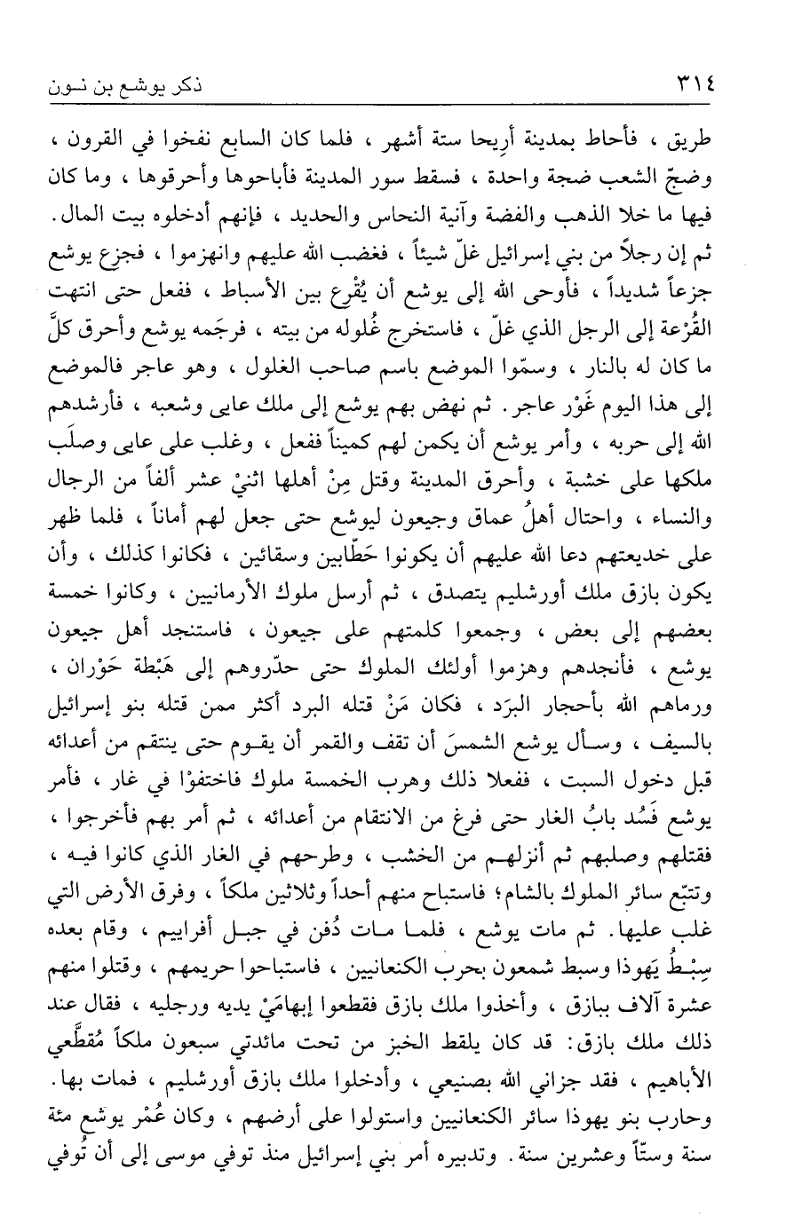 طريق، فأحاط بمدينة أرِيحا ستة أشهر، فلما كان السابع نفخوا في القرون، وضجّ الشعب ضجة واحدة، فسقط سور المدينة فأباحوها وأحرقوها، وما كان فيها ما خلا الذهب والفضة وآنية النحاس والحديد، فإنهم أدخلوه بيت المال. ثم إن رجلًا من بني إسرائيل غلّ شيئًا، فغضب الله عليهم وانهزموا، فجزع يوشع جزعًا شديدًا، فأوحى الله إلى يوشع أن يُقْرع بين الأسباط، ففعل حتى انتهت القُرْعة إلى الرجل الذي غلّ، فاستخرج غُلوله من بيته، فرجَمه يوشع وأحرق كلَّ ما كان له بالنار، وسمّوا الموضع باسم صاحب الغلول، وهو عاجر فالموضع إلى هذا اليوم غَوْر عاجر. ثم نهض بهم يوشع إلى ملك عابي وشعبه، فأرشدهم الله إلى حربه، وأمر يوشع أن يكمن لهم كمينًا ففعل، وغلب على عايي وصلَب ملكها على خشبة، وأحرق المدينة وقتل مِنْ أهلها اثني عشر ألفًا من الرجال والنساء، واحتال أهلُ عماق وجيعون ليوشع حتى جعل لهم أمانًا، فلما ظهر على خديعتهم دعا الله عليهم أن يكونوا حَطّابين وسقائين، فكانوا كذلك، وأن يكون بازق ملك أورشليم يتصدق، ثم أرسل ملوك الأرمانيين، وكانوا خمسة بعضهم إلى بعض، وجمعوا كلمتهم على جيعون، فاستنجد أهل جيعون يوشع، فأنجدهم وهزموا أولئك الملوك حتى حدّروهم إلى هَبْطة حَوْران، ورماهم الله بأحجار البرَد، فكان مَنْ قتله البرد أكثر ممن قتله بنو إسرائيل بالسيف، وسأل يوشع الشمسَ أن تقف والقمر أن يقوم حتى ينتقم من أعدائه قبل دخول السبت، ففعلا ذلك وهرب الخمسة ملوك فاختفوْا في غار، فأمر يوشع فَسُد بابُ الغار حتى فرغ من الانتقام من أعدائه، ثم أمر بهم فأخرجوا، فقتلهم وصلبهم ثم أنزلهم من الخشب، وطرحهم في الغار الذي كانوا فيه، وتتبّع سائر الملوك بالشام؛ فاستباح منهم أحدًا وثلاثين ملكًا، وفرق الأرض التي غلب عليها. ثم مات يوشع، فلما مات دُفن في جبل أفراييم، وقام بعده سِبْطُ يَهوذا وسبط شمعون إحرب الكنعانيين، فاستباحوا حريمهم، وقتلوا منهم عشرة آلاف بازق، وأخذوا ملك بازق فقطعوا إبهامَي يديه ورجليه، فقال عند ذلك ملك بازق: قد كان يلقط الخبز من تحت مائدتي سبعون ملكًا مُقطَّعي الأباهيم، فقد جزاني الله بصنيعي، وأدخلوا ملك بازق أورشليم، فمات بها. وحارب بنو يهوذا سائر الكنعانيين واستولوا على أرضهم، وكان عُمْر يوشع مئة سنة وستًّا وعشرين سنة. وتدبيره أمر بني إسرائيل منذ توفي موسى إلى أن تُوفي