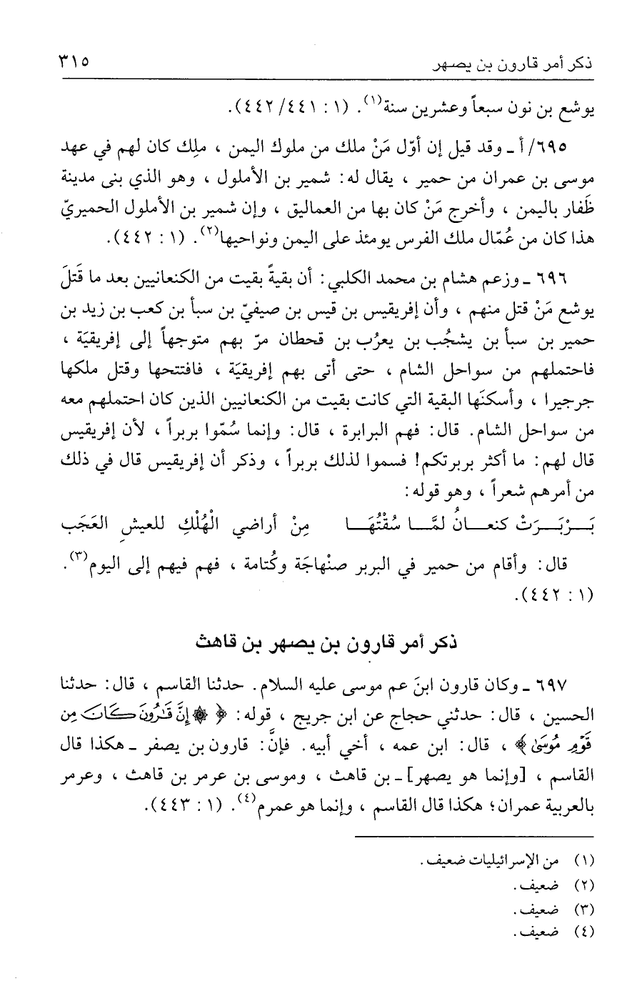 ٦٩٧ - وكان قارون ابنَ عم موسى - عليه السلام -. حدثنا القاسم، قال: حدثنا الحسين، قال: حدثني حجاج عن ابن جريج، قوله: {إِنَّ قَارُونَ كَانَ مِنْ قَوْمِ مُوسَى}، قال: ابن عمه، أخي أبيه. فإنَّ: قارون بن يصفر - هكذا قال القاسم، [وإنما هو يصهر]- بن قاهث، وموسى بن عرمر بن قاهث، وعرمر بالعربية عمران؛ هكذا قال القاسم، وإنما هو عمرم (٤). (١: ٤٤٣).