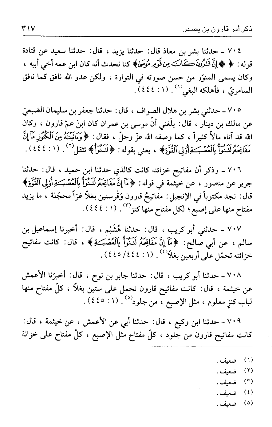 ٧٠٥ - حدثني بشر بن هلال الصواف، قال: حدثنا جعفر بن سليمان الضبعيّ عن مالك بن دينار، قال: بلَغني أنّ موسى بن عمران كان ابنَ عمّ قارون، وكان الله قد آتاه مالًا كثيرًا، كما وصفه الله عزّ وجلّ، فقال: {وَآتَينَاهُ مِنَ الْكُنُوزِ مَا إِنَّ مَفَاتِحَهُ لَتَنُوءُ بِالْعُصْبَةِ أُولِي الْقُوَّةِ}، يعني بقوله: {لَتَنُوءُ} تثقل (٢). (١: ٤٤٤).