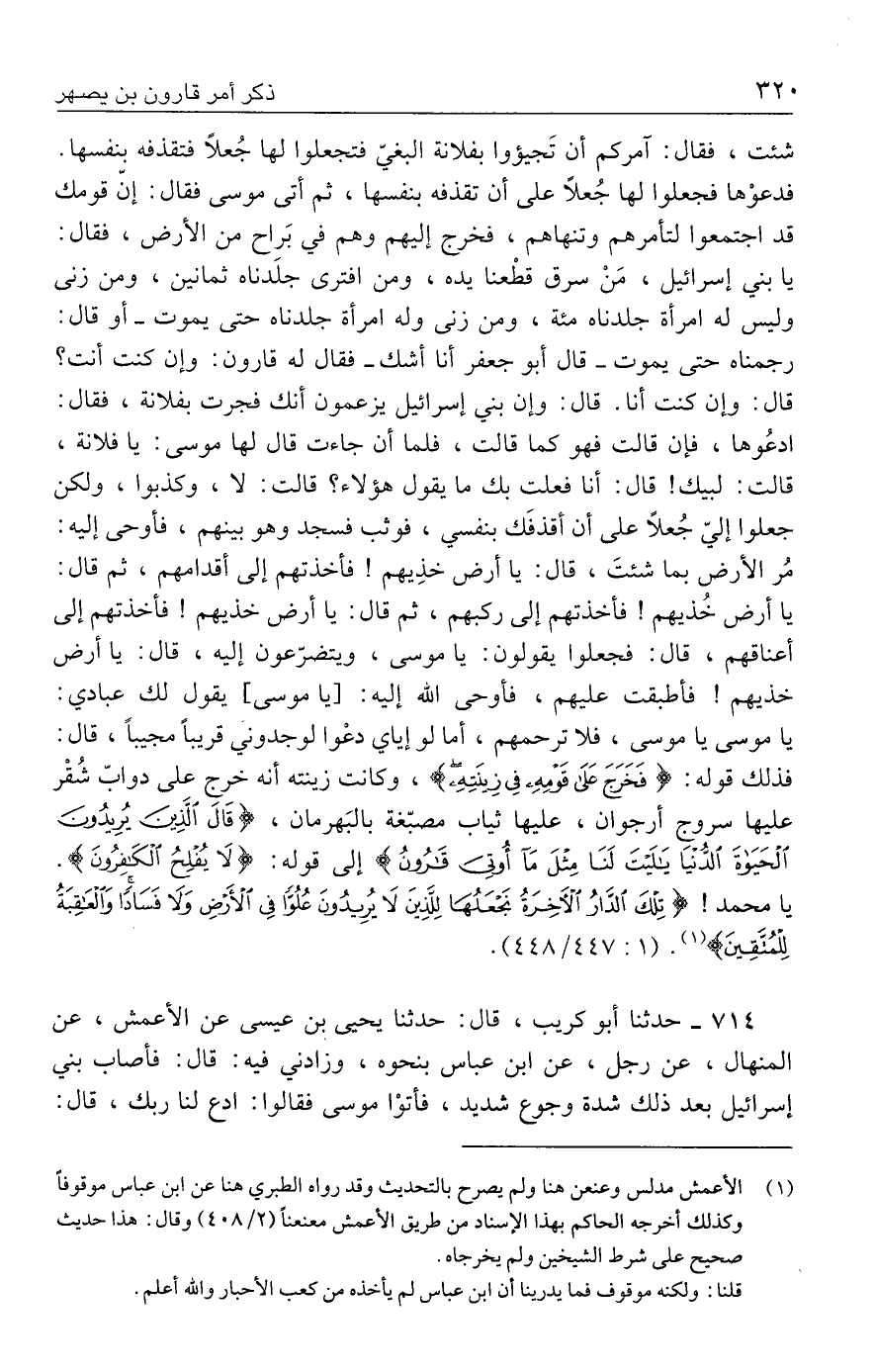 شئت، فقال: آمركم أن تَجيؤوا بفلانة البغيّ فتجعلوا لها جُعلًا فتقذفه بنفسها. فدعوْها فجعلوا لها جُعلًا على أن تقذفه بنفسها، ثم أتى موسى فقال: إنّ قومك قد اجتمعوا لتأمرهم وتنهاهم، فخرج إليهم وهم في بَراح من الأرض، فقال: يا بني إسرائيل، مَنْ سرق قطْعنا يده، ومن افترى جلَدناه ثمانين، ومن زنى وليس له امرأة جلدناه مئة، ومن زنى وله امرأة جلدناه حتى يموت -أو قال: رجمناه حتى يموت- قال أبو جعفر أنا أشك -فقال له قارون: وإن كنت أنت؟ قال: وإن كنت أنا. قال: وإن بني إسرائيل يزعمون أنك فجرت بفلانة، فقال: ادعُوها، فإن قالت فهو كما قالت، فلما أن جاءت قال لها موسى: يا فلانة، قالت: لبيك! قال: أنا فعلت بك ما يقول هؤلاء؟ قالت: لا، وكذبوا، ولكن جعلوا إليّ جُعلًا على أن أقذفَك بنفسي، فوثب فسجد وهو بينهم، فأوحى إليه: مُر الأرض بما شئتَ، قال: يا أرض خذِيهم! فأخذتهم إلى أقدامهم، ثم قال: يا أرض خُذيهم! فأخذتهم إلى ركبهم، ثم قال: يا أرض خذيهم! فأخذتهم إلى أعناقهم، قال: فجعلوا يقولون: يا موسى، ويتضرّعون إليه، قال: يا أرض خذيهم! فأطبقت عليهم، فأوحى الله إليه: [يا موسى] يقول لك عبادي: يا موسى يا موسى، فلا ترحمهم، أما لو إياي دعْوا لوجدوني قريبًا مجيبًا، قال: فذلك قوله: {فَخَرَجَ عَلَى قَوْمِهِ فِي زِينَتِهِ}، وكانت زينته أنه خرج على دوابّ شُقْر عليها سروج أرجوان، عليها ثياب مصبّغة بالبَهرمان، {قَال الَّذِينَ يُرِيدُونَ الْحَيَاةَ الدُّنْيَا يَاليتَ لَنَا مِثْلَ مَا أُوتِيَ قَارُونُ} إلى قوله: لَا يُفْلِحُ الْكَافِرُونَ}. يا محمد! {تِلْكَ الدَّارُ الْآخِرَةُ نَجْعَلُهَا لِلَّذِينَ لَا يُرِيدُونَ عُلُوًّا فِي الْأَرْضِ وَلَا فَسَادًا وَالْعَاقِبَةُ لِلْمُتَّقِينَ} (١). (١: ٤٤٧/ ٤٤٨).