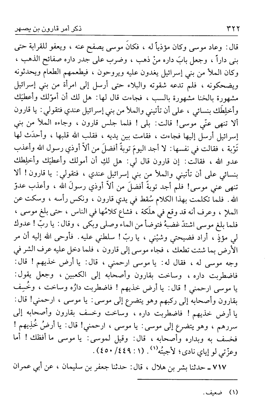 قال: وعاد موسى وكان مؤذيًا له، فكانَ موسى يصفح عنه، ويعفو للقرابة حتى بني دارًا، وجعل بابَ داره منْ ذهب، وضرب علي جدر داره صفائح الذهب، وكان الملأ من بني إسرائيل يغدون عليه ويروحون، فيطعمهم الطعام ويحدثونه ويضحكونه، فلم تدعه شقوته والبلاء حتى أرسل إلي امرأة من بني إسرائيل مشهورة بالخنا مشهورة بالسب، فجاءت قال لها: هل لك أن أموّلك وأعطيَك وأخلِطَك بنسائي، علي أن تأتيني والملأ من بني إسرائيل عندي فتقوله: يا قارون ألا تنهي عنّي موسى! قالت: بلى! فلما جلس قارون، وجاءه الملأ من بني إسرائيل أرسل إليها فجاءت، فقامت بين يديه، فقلب الله قلبها، وأحدَث لها تَوْبة، فقالت في نفسها: لا أجد اليومَ توبةً أفضلَ من ألّا أوذي رسول الله وأعذب عدو الله، فقالت: إن قارون قال لي: هل لكِ أن أمولك وأعطيَك وأخلِطك بنسائي علي أن تأتيني والملأ من بني إسرائيل عندي، فتقوله: يا قارون! ألا تنهي عني موسى! فلم أجد توبةَ أفضلَ من ألّا أوذي رسولَ الله، وأعذب عدوّ الله. فلما تكلمت بهذا الكلام سُقط في يدي قارون، ونكس رأسه، وسكت عن الملإ، وعرف أنه قد وقع في هلَكة، فشاع كلامُها في الناس، حتى بلغ موسى، فلما بلغ موسى اشتدّ غضبهُ فتوضأ من الماء وصلي وبكي، وقال: يا ربّ! عدوك لي مؤذٍ، أراد فضيحتي وشيني، يا ربّ! سلطني عليه. فأوحي الله إليه أن مر الأرض بما شئت تطعك، فجاء موسى إلي قارون، فلما دخل عليه عرف الشر في وجه موسى له، فقال له: يا موسى ارحمني، قال: يا أرض خذيهم! قال: فاضطربت داره، وساخت بقارون وأصحابه إلي الكعبين، وجعل يقول: يا موسى ارحمني! قال: يا أرض خذيهم! فاضطربت دارُه وساخت، وخُسِف بقارون وأصحابه إلي ركبهم وهو يتضرع إلي موسى: يا موسى، ارحمني! قال: يا أرض خذيهم! فاضطربت داره، وساخت وخسف بقارون وأصحابه إلي سررهم، وهو يتضرع إلي موسى: يا موسى، ارحمني! قال: يا أرضُ خُذِيهم! فخسف به وبداره وأصحابه، قال: وقيل لموسي: يا موسى ما أفظك! أما وعزّتي لو إياي نادي؛ لأجبتُه (١). (١: ٤٤٩/ ٤٥٠).