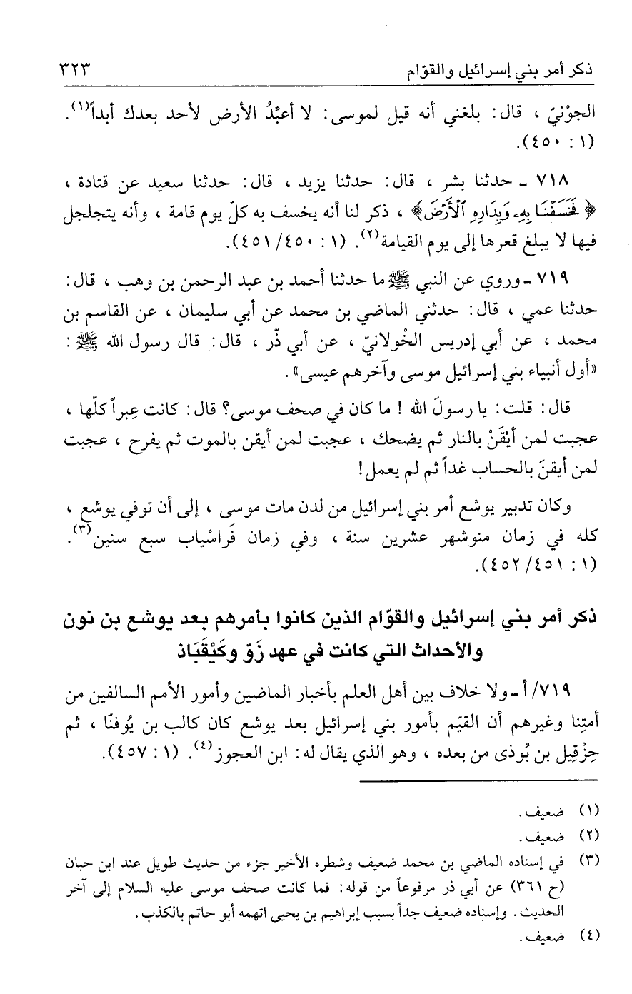 ٧١٩ / أ- ولا خلاف بين أهل العلم بأخبار الماضين وأمور الأمم السالفين من أمتِنا وغيرهم أن القيّم بأمور بني إسرائيل بعد يوشع كان كالب بن يُوفنّا، ثم حِزْقِيل بن بُوذي من بعده، وهو الذي يقال له: ابن العجوز (٤). (١: ٤٥٧).
