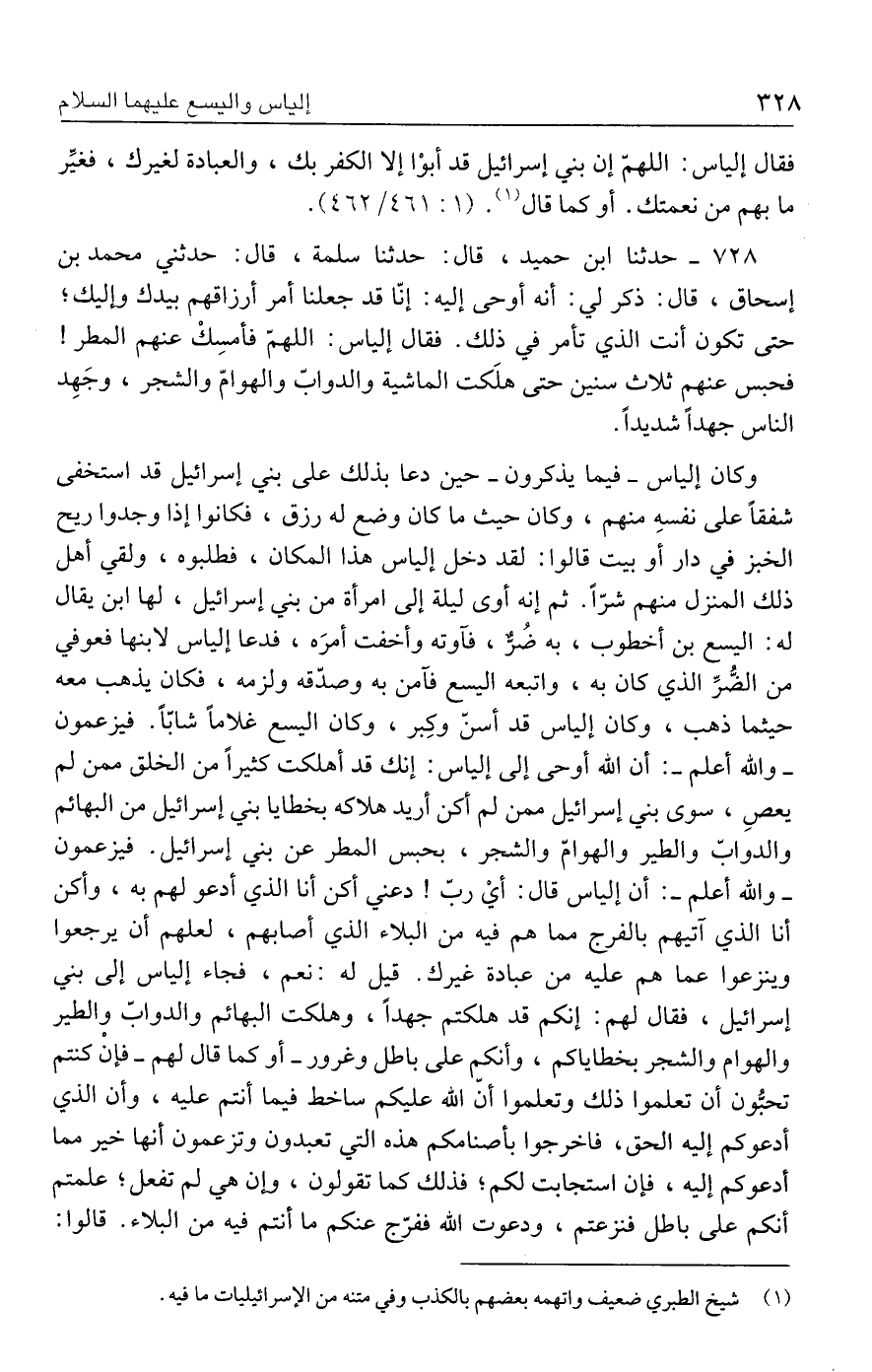 ٧٢٨ - حدثنا ابن حميد، قال: حدثنا سلمة، قال: حدثني محمد بن إسحاق، قال: ذكر لي: أنه أوحي إليه: إنّا قد جعلنا أمر أرزاقهم بيدك وإليك؛ حتى تكون أنت الذي تأمر في ذلك. فقال إلياس: اللهمّ فأمسِكْ عنهم المطر! فحبس عنهم ثلاث سنين حتى هلَكت الماشية والدوابّ والهوامّ والشجر، وجَهِد الناس جهدًا شديدًا.