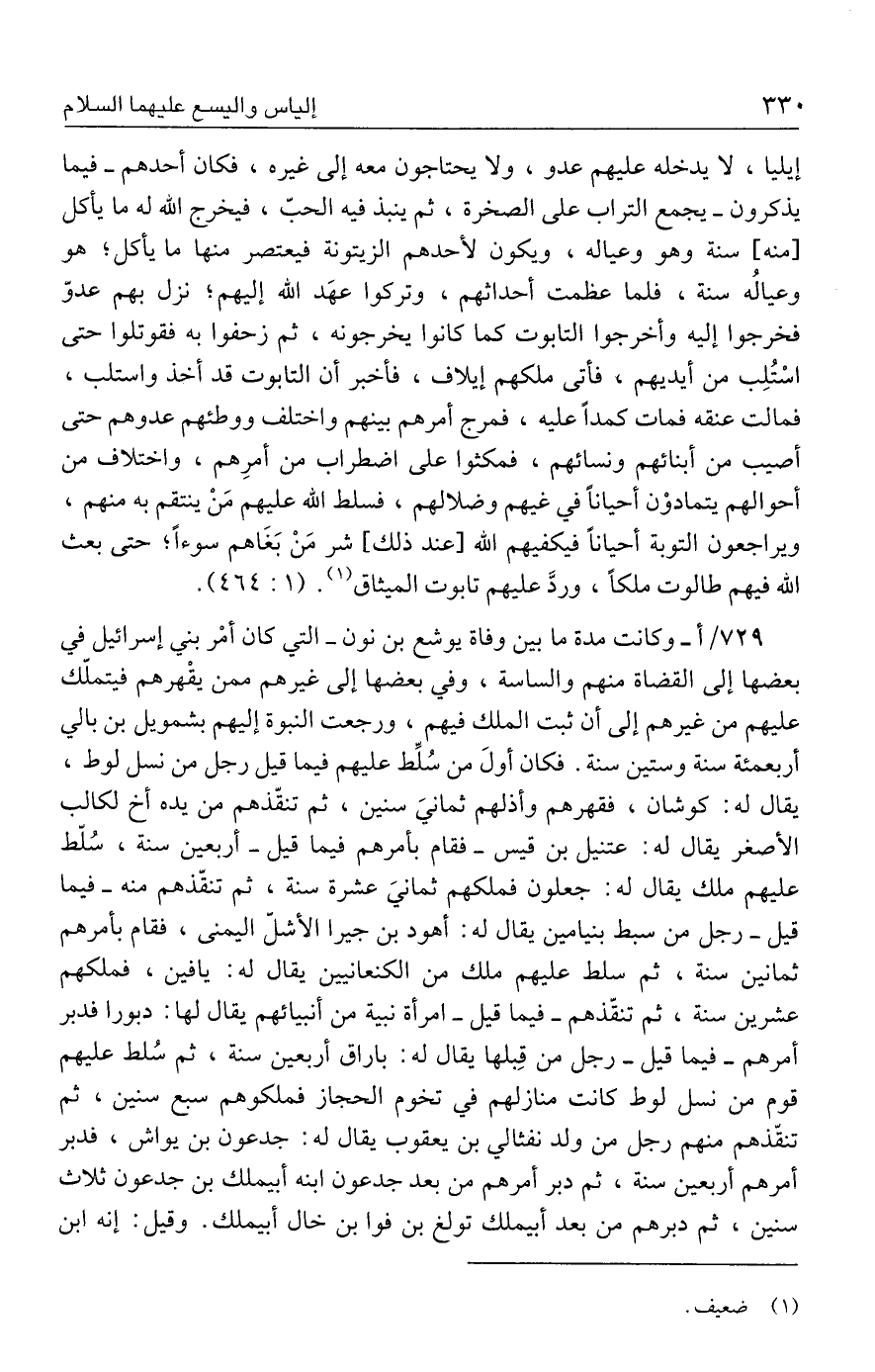 ٧٢٩ / أ- وكانت مدة ما بين وفاة يوشع بن نون- التي كان أمْر بني إسرائيل في بعضها إلي القضاة منهم والساسة، وفي بعضها إلي غيرهم ممن يقْهرهم فيتملّك عليهم من غيرهم إلي أن ثبت الملك فيهم، ورجعت النبوة إليهم بشمويل بن بالي أربعمئة سنة وستين سنة. فكان أولَ من سُلِّط عليهم فيما قيل رجل من نسل لوط، يقال له: كوشان، فقهرهم وأذلهم ثمانيَ سنين، ثم تنقّذهم من يده أخ لكالب الأصغر يقال له: عتنيل بن قيس -فقام بأمرهم فيما قيل- أربعين سنة، سُلّط عليهم ملك يقال له: جعلون فملكهم ثمانيَ عشرة سنة، ثم تنقّذهم منه -فيما قيل- رجل من سبط بنيامين يقال له: أهود بن جيرا الأشلّ اليمنى، فقام بأمرهم ثمانين سنة، ثم سلط عليهم ملك من الكنعانيين يقال له: يافين، فملكهم عشرين سنة، ثم تنقّذهم -فيما قيل- امرأة نبية من أنبيائهم يقال لها: دبورا فدبر أمرهم -فيما قيل- رجل من قِبلها يقال له: باراق أربعين سنة، ثم سُلط عليهم قوم من نسل لوط كانت منازلهم في تخوم الحجاز فملكوهم سبع سنين، ثم تنقّذهم منهم رجل من ولد نفثالي بن يعقوب يقال له: جدعون بن يواش، فدبر أمرهم أربعين سنة، ثم دبر أمرهم من بعد جدعون ابنه أبيملك بن جدعون ثلاث سنين، ثم دبرهم من بعد أبيملك تولغ بن فوا بن خال أبيملك. وقيل: إنه ابن