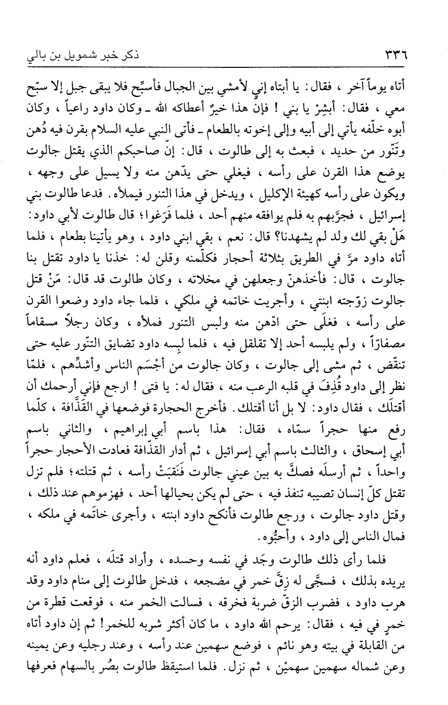 أتاه يومًا آخر، فقال: يا أبتاه إني لأمشي بين الجبال فأسبِّح فلا يبقي جبل إلا سبّح معي، فقال: أبشِرْ يا بني! فإن هذا خيرٌ أعطاكه الله -وكان داود راعيًا، وكان أبوه خلّفه يأتي إلي أبيه وإلي إخوته بالطعام- فأتي النبي - عليه السلام - بقرن فيه دُهن وتَنّور من حديد، فبعث به إلي طالوت، قال: إنّ صاحبكم الذي يقتل جالوت يوضع هذا القرن علي رأسه، فيغلي حتى يدّهن منه ولا يسيل علي وجهه، ويكون علي رأسه كهيئة الإكليل، ويدخل في هذا التنور فيملأه. فدعا طالوت بني إسرائيل، فجرَّبهم به فلم يوافقه منهم أحد، فلما فَرَغوا؛ قال طالوت لأبي داود: هَلْ بقي لك ولد لم يشهدنا؟ قال: نعم، بقي ابني داود، وهو يأتينا بطعام، فلما أتاه داود مرَّ في الطريق بثلاثة أحجار فكلّمنه وقلن له: خذنا يا داود تقتل بنا جالوت، قال: فأخذهنّ وجعلهن في مخلاته، وكان طالوت قد قال: مَنْ قتل جالوت زوّجته ابنتي، وأجريت خاتمه في ملكي، فلما جاء داود وضعوا القرن علي رأسه، فغلَي حتى ادّهن منه ولبس التنور فملأه، وكان رجلًا مسقامًا مصفارًّا، ولم يلبسه أحد إلا تقلقل فيه، فلما لبِسه داود تضايق التنّور عليه حتى تنقّض، ثم مشي إلي جالوت، وكان جالوت من أجْسَم الناس وأشدَّهم، فلمّا نظر إلي داود قُذِفَ في قلبه الرعب منه، فقال له: يا فتي! ارجع فإني أرحمك أن أقتلَك، فقال داود: لا بل أنا أقتلك. فأخرج الحجارة فوضعها في القَذَّافة، كلّما رفع منها حجرًا سمّاه، فقال: هذا باسم أبي إبراهيم، والثاني باسم أبي إسحاق، والثالث باسم أبي إسرائيل، ثم أدار القذّافة فعادت الأحجار حجرًا واحدًا، ثم أرسلَه فصكَّ به بين عيني جالوت فَنَقبَتْ رأسه، ثم قتلته؛ فلم تزل تقتل كلّ إنسان تصيبه تنفذ فيه، حتى لم يكن بحيالها أحد، فهزموهم عند ذلك، وقتل داود جالوت، ورجع طالوت فأنكح داود ابنته، وأجري خاتَمه في ملكه، فمال الناس إلي داود، وأحبُّوه.