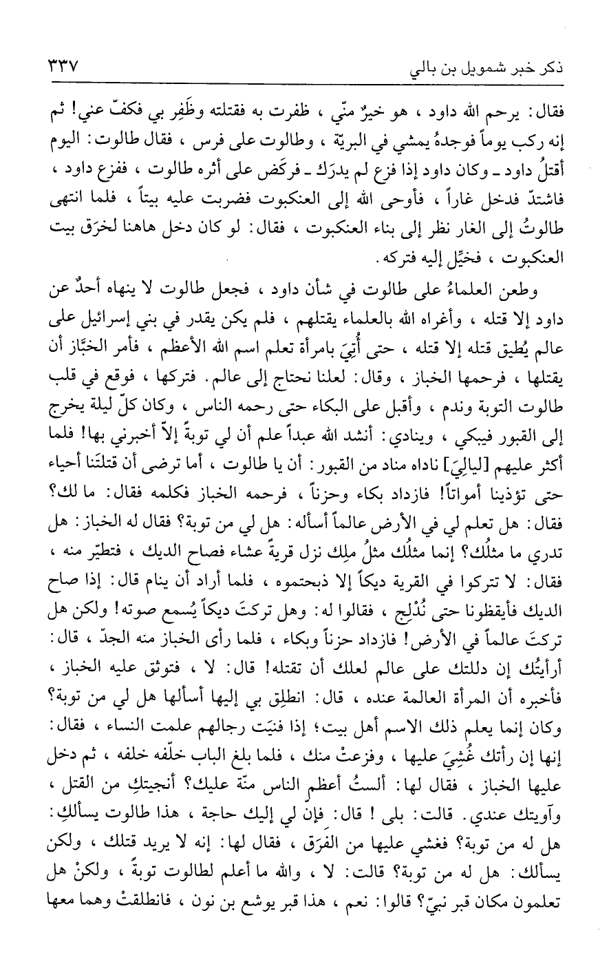 وطعن العلماءُ علي طالوت في شأن داود، فجعل طالوت لا ينهاه أحدٌ عن داود إلا قتله، وأغراه الله بالعلماء يقتلهم، فلم يكن يقدر في بني إسرائيل علي عالم يُطيق قتله إلا قتله، حتى أُتِيَ بامرأة تعلم اسم الله الأعظم، فأمر الخبَّاز أن يقتلها، فرحمها الخباز، وقال: لعلنا نحتاج إلي عالم. فتركها، فوقع في قلب طالوت التوبة وندم، وأقبل علي البكاء حتى رحمه الناس، وكان كلّ ليلة يخرج إلي القبور فيبكي، وينادي: أنشد الله عبدًا علم أن لي توبةً إلّا أخبرني بها! فلما أكثر عليهم [ليالِيَ] ناداه مناد من القبور: أن يا طالوت، أما ترضي أن قتلتَنا أحياء حتى تؤذينا أمواتًا! فازداد بكاء وحزنًا، فرحمه الخباز فكلمه فقال: ما لك؟ فقال: هل تعلم لي في الأرض عالمًا أسأله: هل لي من توبة؟ فقال له الخباز: هل تدري ما مثلُك؟ إنما مثلُك مثلُ ملِك نزل قرية عشاء فصاح الديك، فتطيّر منه، فقال: لا تتركوا في القرية ديكًا إلا ذبحتموه، فلما أراد أن ينام قال: إذا صاح الديك فأيقظونا حتى نُدْلِج، فقالوا له: وهل تركتَ ديكًا يُسمع صوته! ولكن هل تركتَ عالمًا في الأرض! فازداد حزنًا وبكاء، فلما رأي الخباز منه الجدّ، قال: أرأيتُك إن دللتك علي عالم لعلك أن تقتله! قال: لا، فتوثق عليه الخباز، فأخبره أن المرأة العالمة عنده، قال: انطلِق بي إليها أسألها هل لي من توبة؟ وكان إنما يعلم ذلك الاسم أهل بيت؛ إذا فنيَت رجالهم علمت النساء، فقال: إنها إن رأتك غُشِيَ عليها، وفزعتْ منك، فلما بلغ الباب خلّفه خلفه، ثم دخل عليها الخباز، فقال لها: ألستُ أعظم الناس منّة عليك؟ أنجيتكِ من القتل، وآويتك عندي. قالت: بلى! قال: فإنّ لي إليك حاجة، هذا طالوت يسألكِ: هل له من توبة؟ فغشي عليها من الفَرَق، فقال لها: إنه لا يريد قتلك، ولكن يسألك: هل له من توبة؟ قالت: لا، والله ما أعلم لطالوت توبةً، ولكنْ هل تعلمون مكان قبر نبيّ؟ قالوا: نعم، هذا قبر يوشع بن نون، فانطلقتْ وهما معها